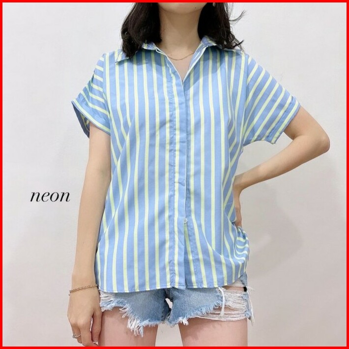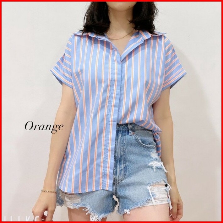 Kemeja Wanita Lengan Pendek Salur Bahan Katun Import-717 Mis