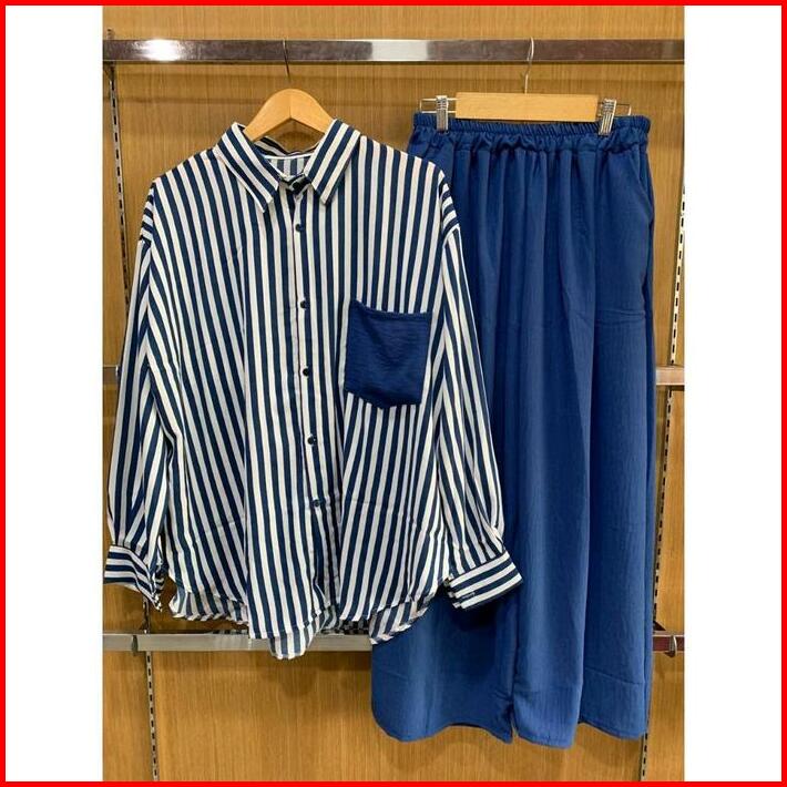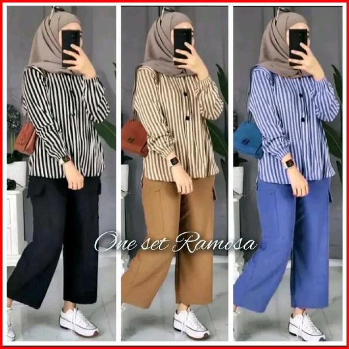 Ramosa Set Crinkel Setelan Wanita Kemeja Cargo Set Muslimah Kemeja Salur