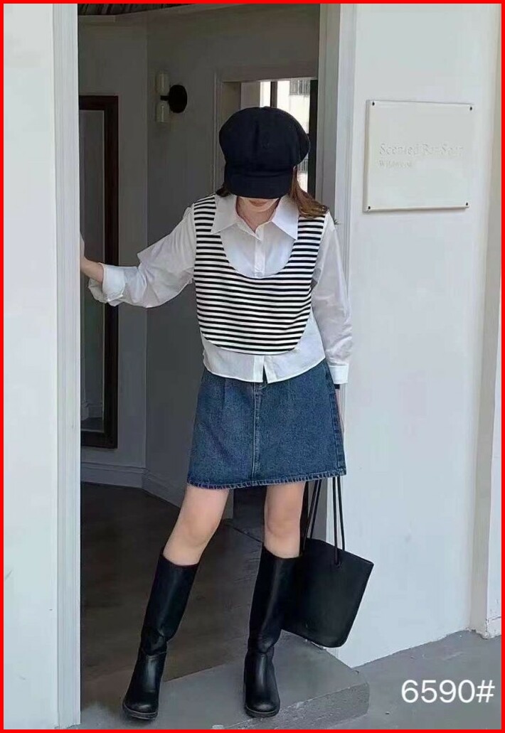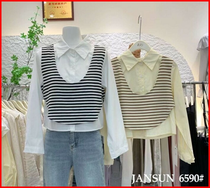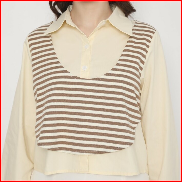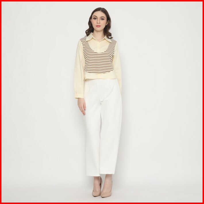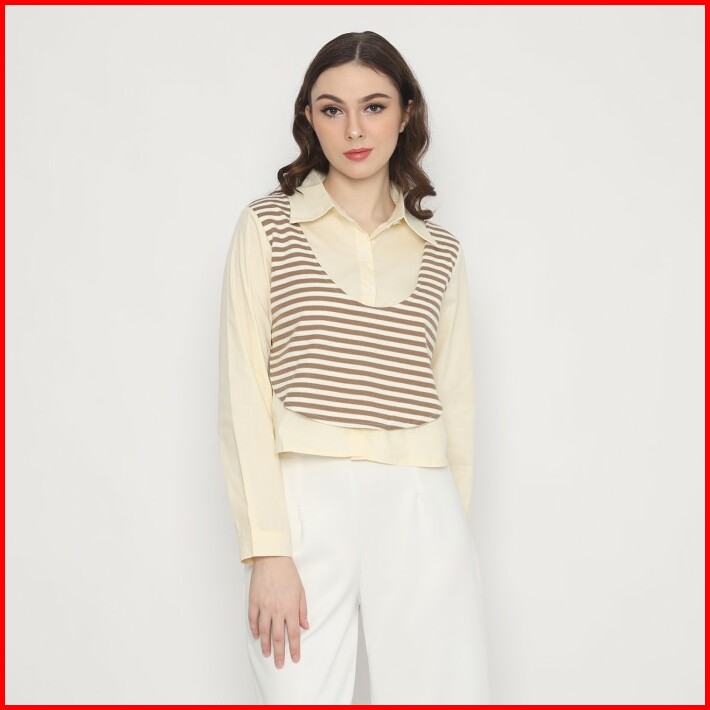Mineola Blus Kemeja Wanita Beige Crop Katun Premium Impor Rompi Salur