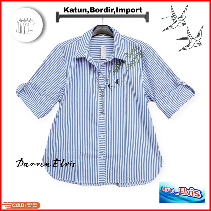 Kemeja Wanita Import Salur Biru Bordir Wallet