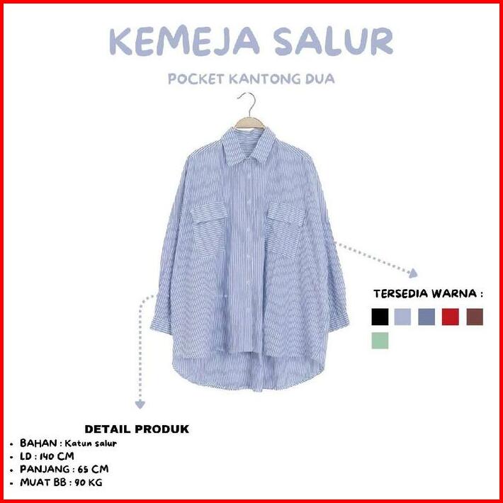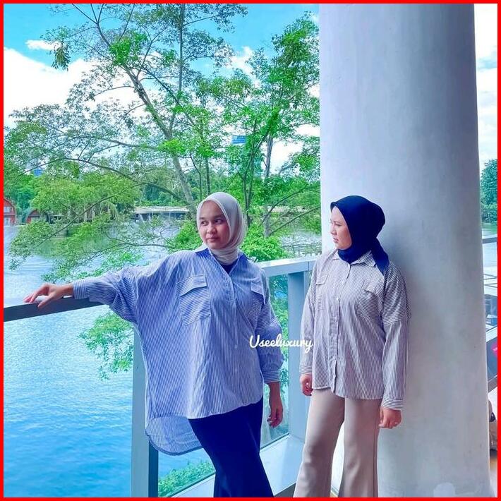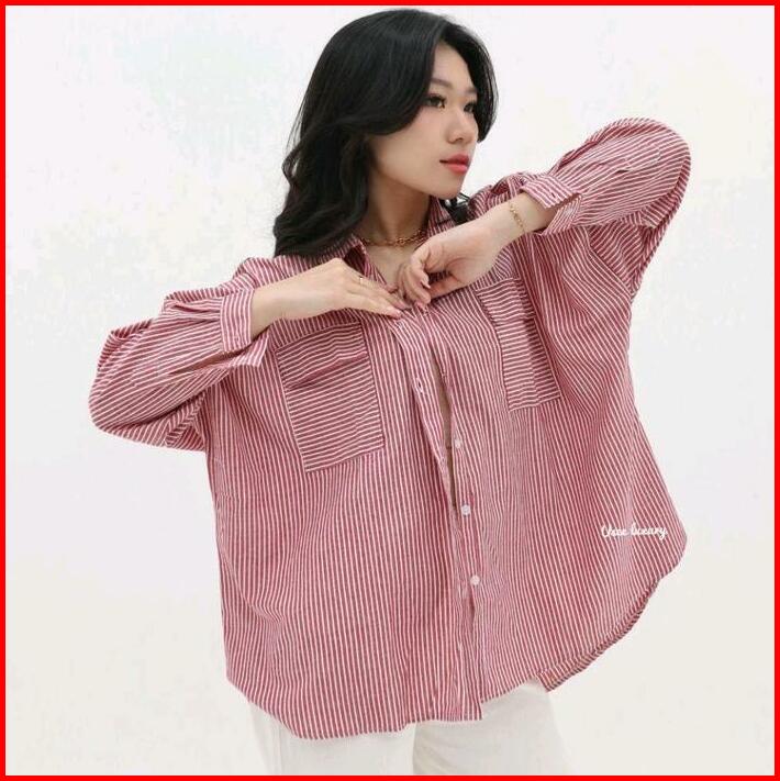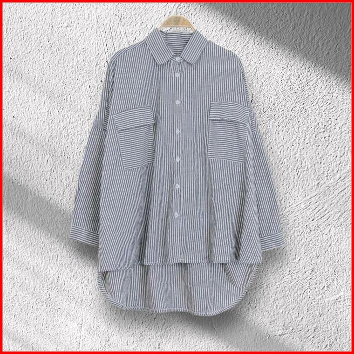 Kemeja Salur Stripe Wanita Tangan Panjang Bahan Katun Jumbo Oversize Basic Untuk Kerja Kerah Kemeja Kantong Atasan Garis