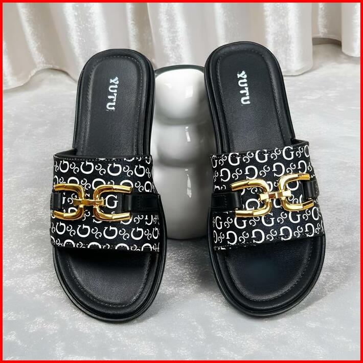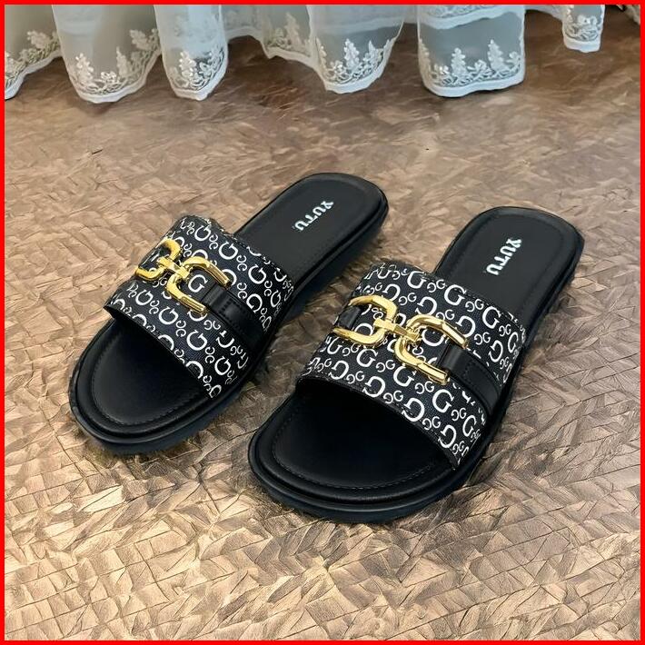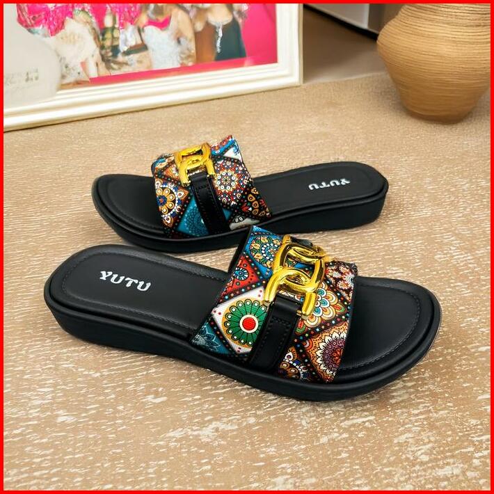 Sandal Teplek Slop Slip On Wanita Kekinian Flat Gesper Pita D Platform Trendy 2025 Sendal Cewek Shoes Karet 2422-10
