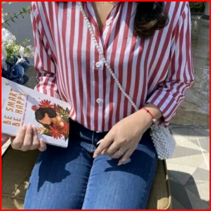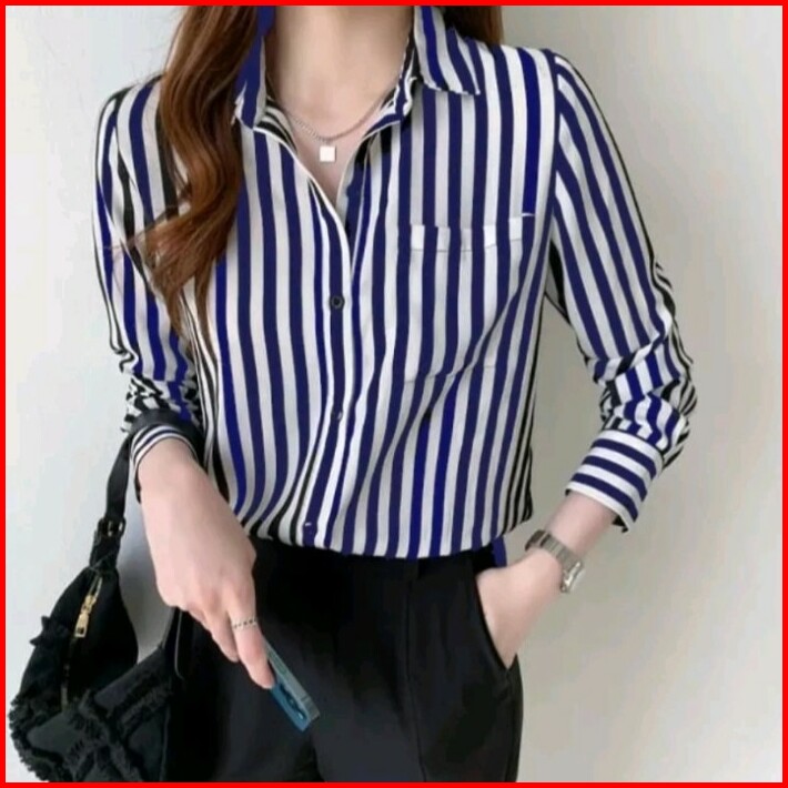 Blouse Wanita Lengan Panjang Stripe Top Kemeja Atasan Salur Wanita