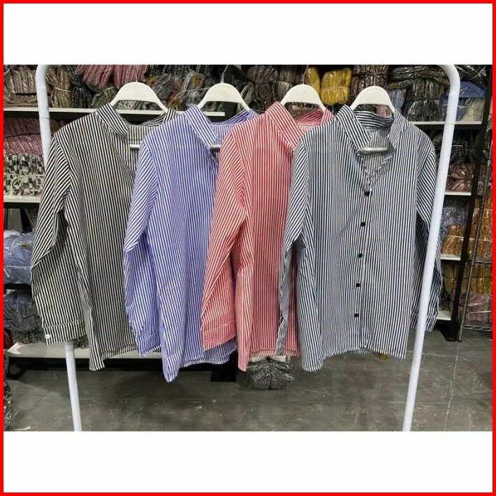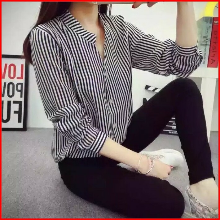 Kemeja Korea V-neck Atasan Salur Wanita Kemeja Stripe Long Sleeve