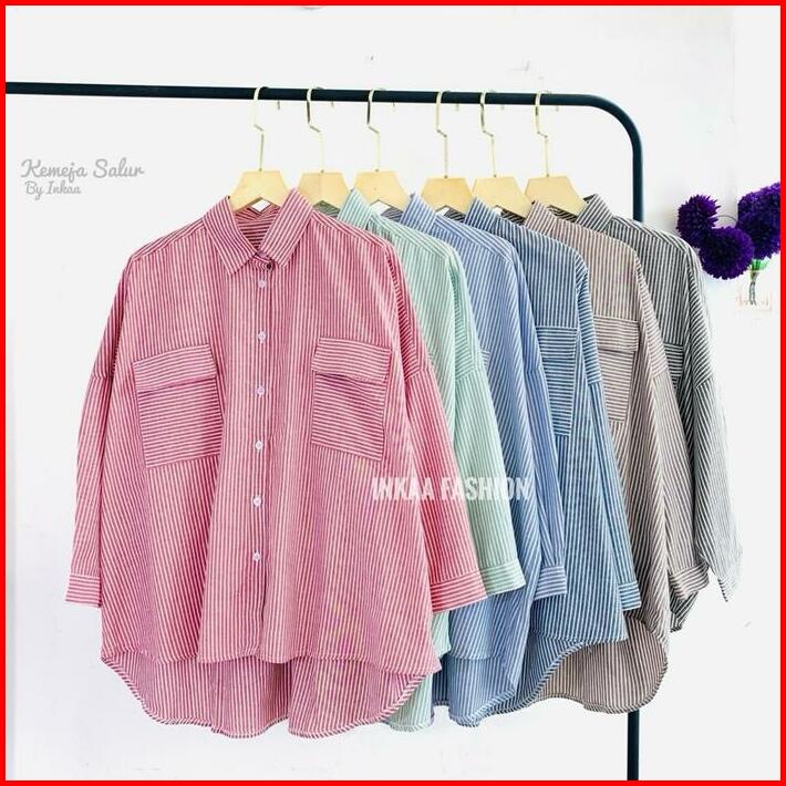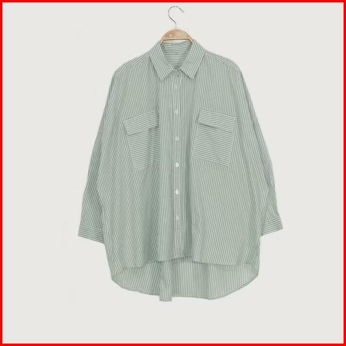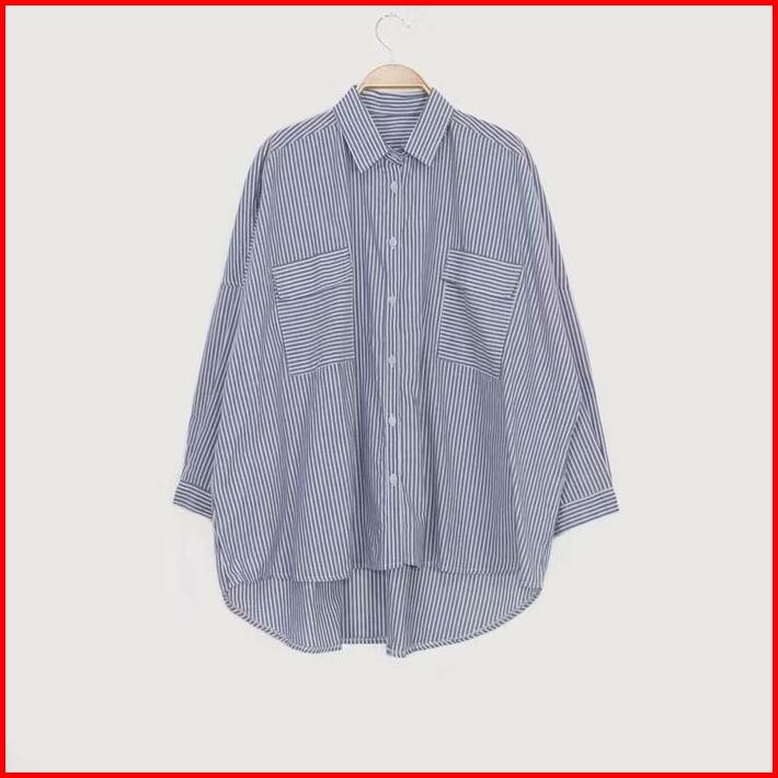 Kemeja Salur Wanita Oversize Bahan Katun Pakai Kancing Model Basic Atasan Stripe Kerja Panjang Baju Garis