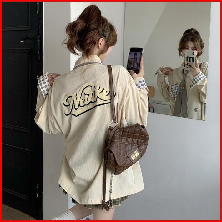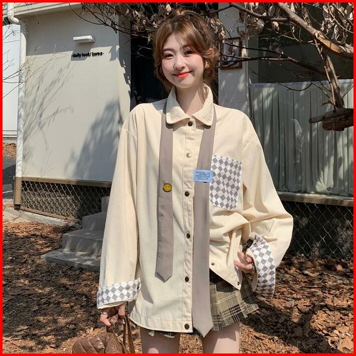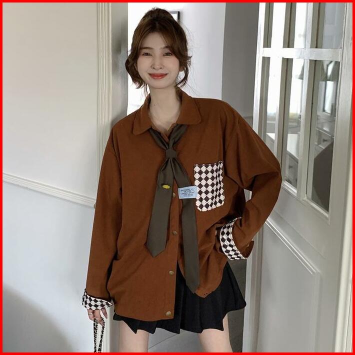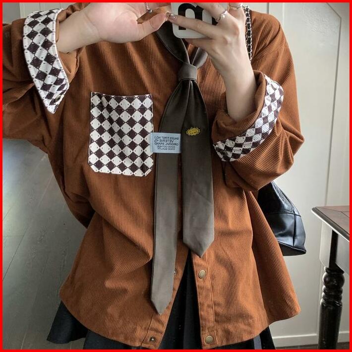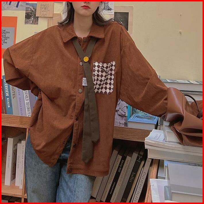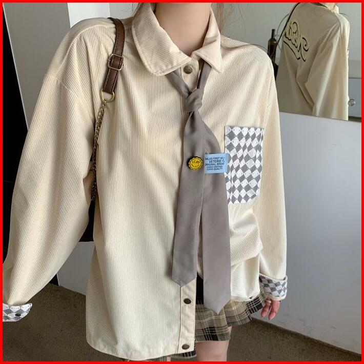 Kemeja Korduroi Korean Vintage Kemeja Wanita Oversize Atasan Lengan Panjang Termasuk Lencana Dasi