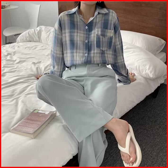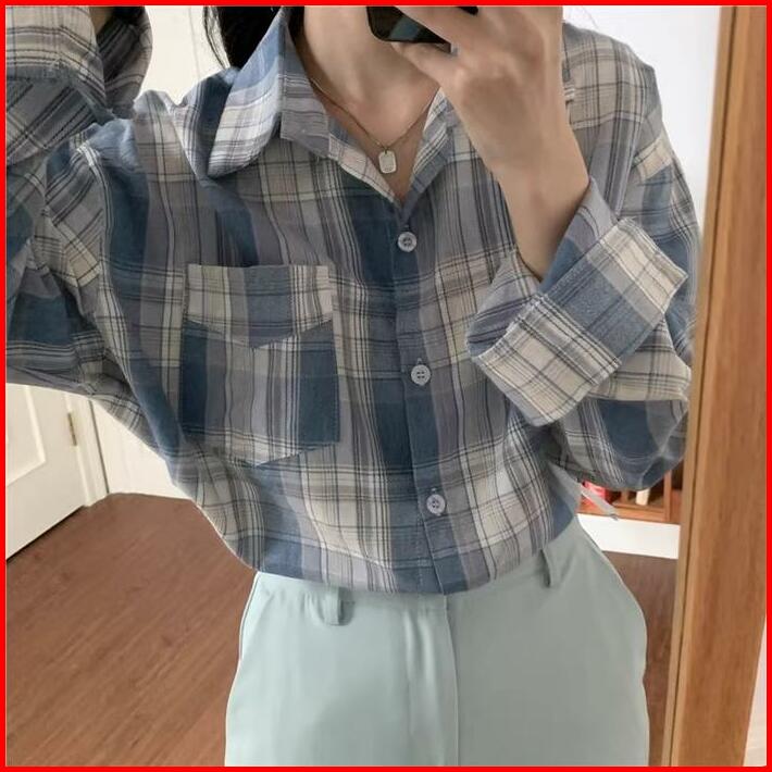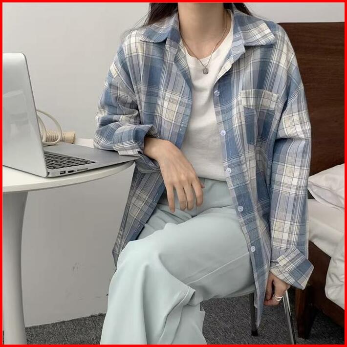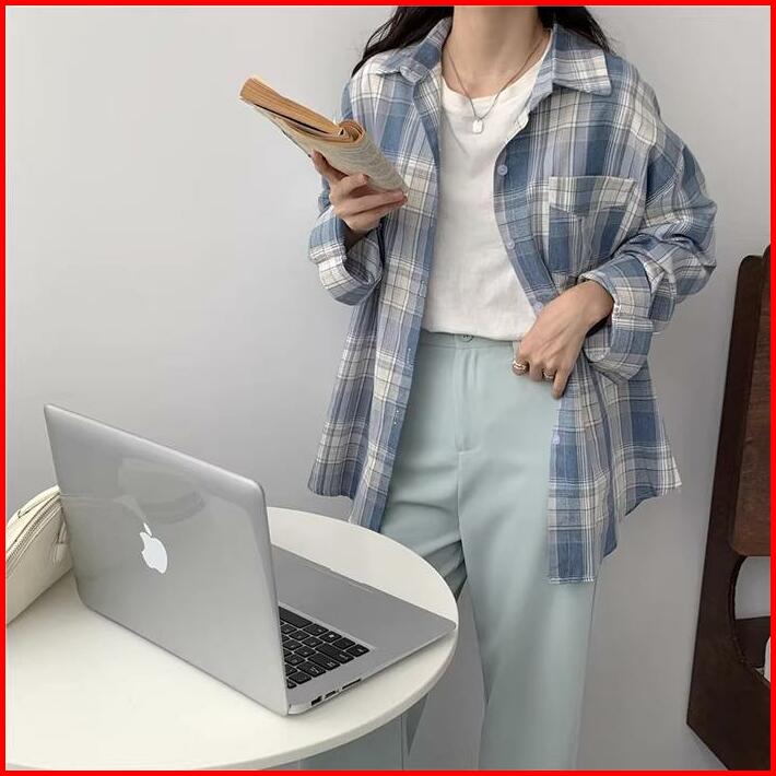 Kemeja Kotak-kotak Biru Kemeja Wanita Lengan Panjang Korean Style Atasan Linen Casual Oversize