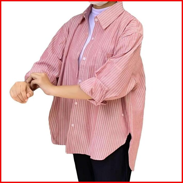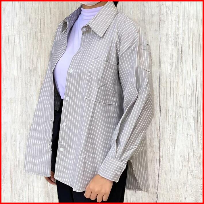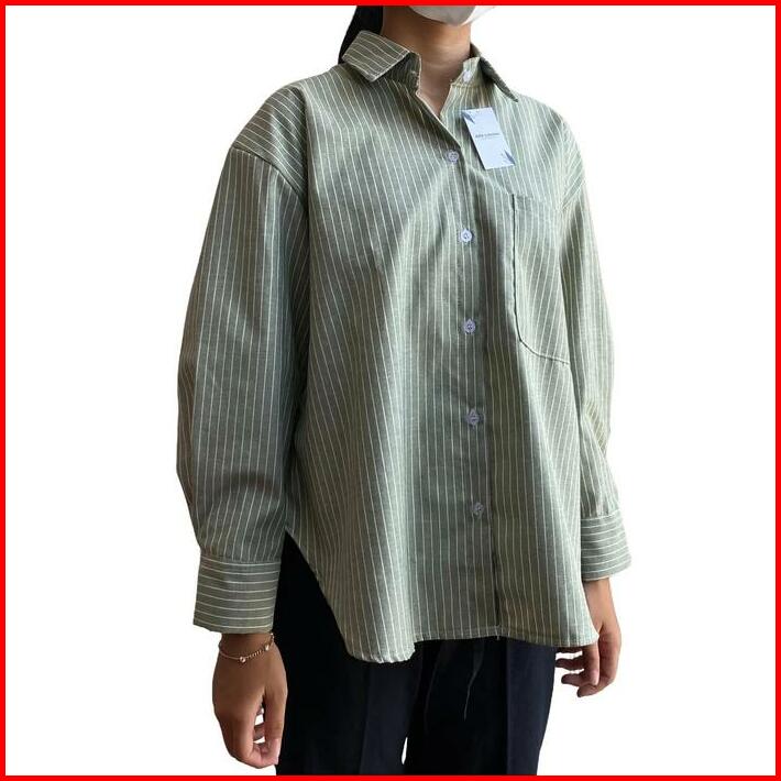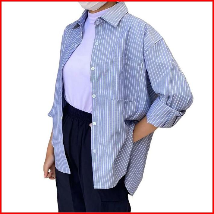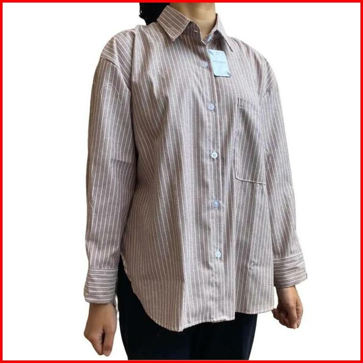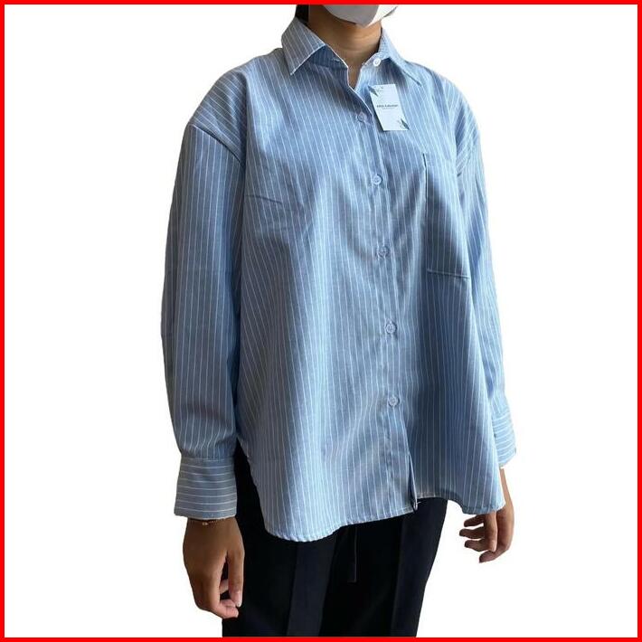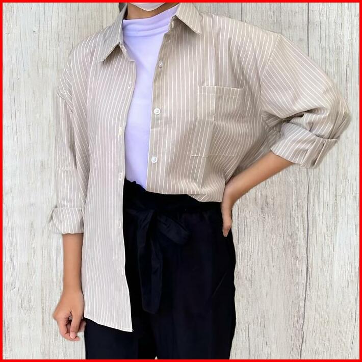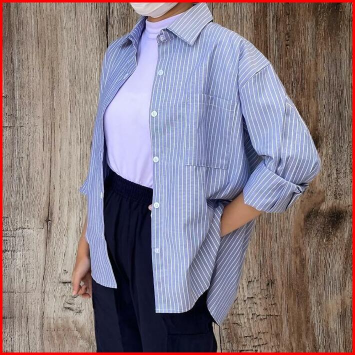 Hanna Stripe Kemeja Salur Wanita Basic Oversize Baju Atasan Panjang Hitam Katun Casual Formal Linen Dewasa Shakila Kerja