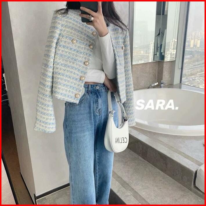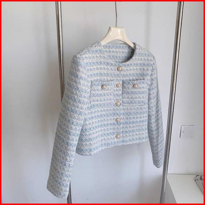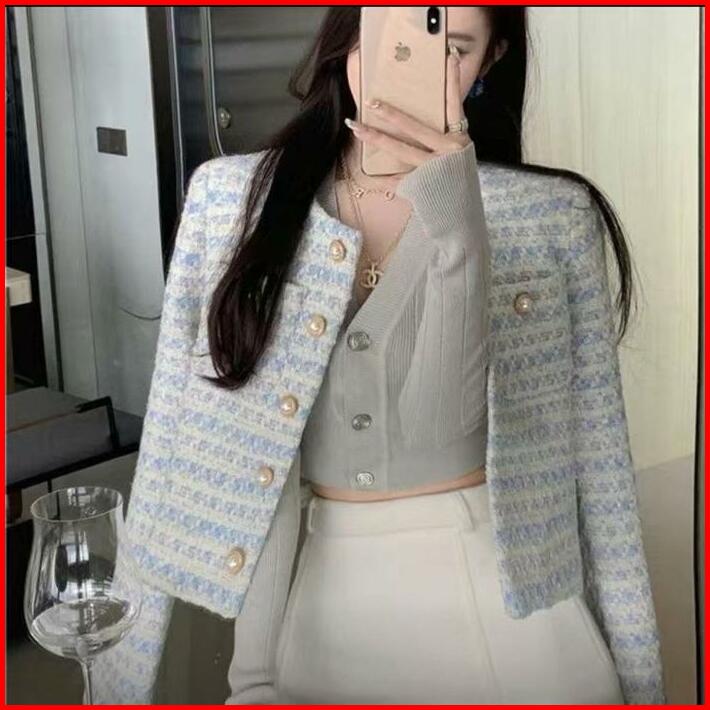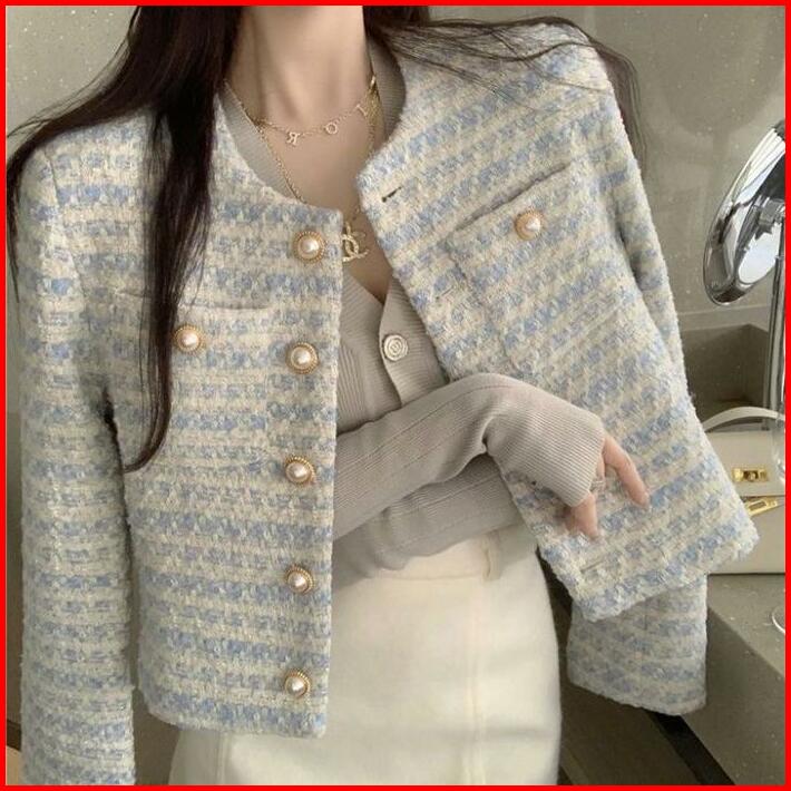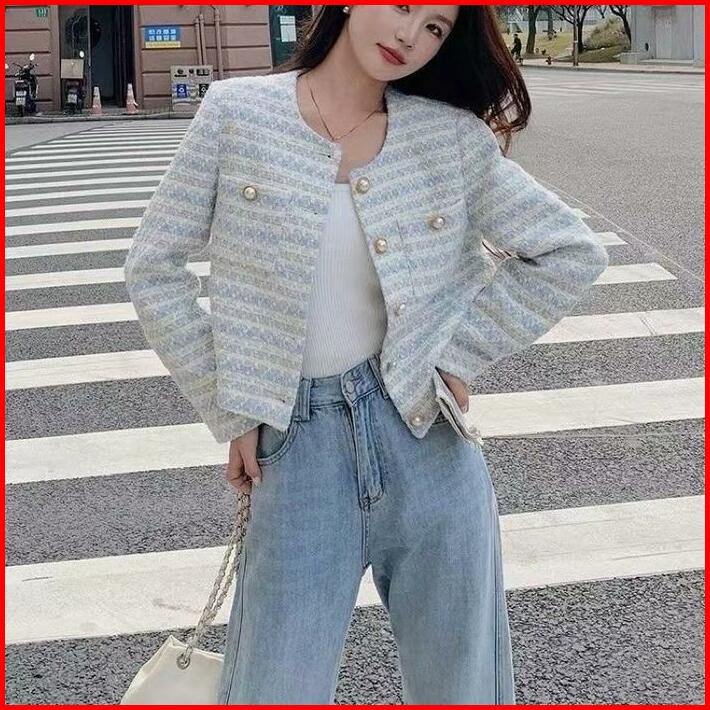Jaket Cardigan Casual Biru Tweed Lengan Panjang Blazer Basic Terbaru Atasan Wanita Outer Korea M601
