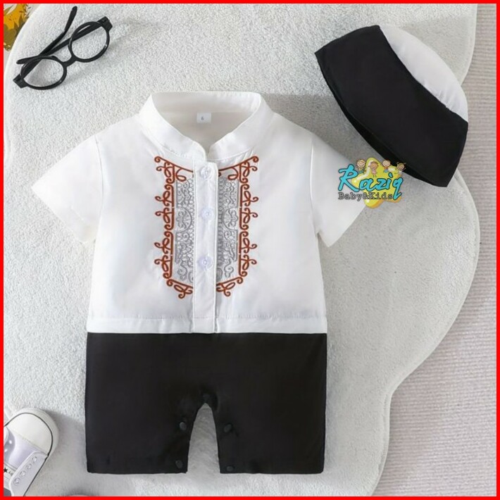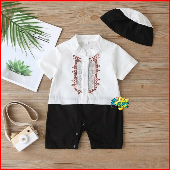 Baju Koko Bayi Model Romper Bordir Jumper Muslim Anak Dengan Peci