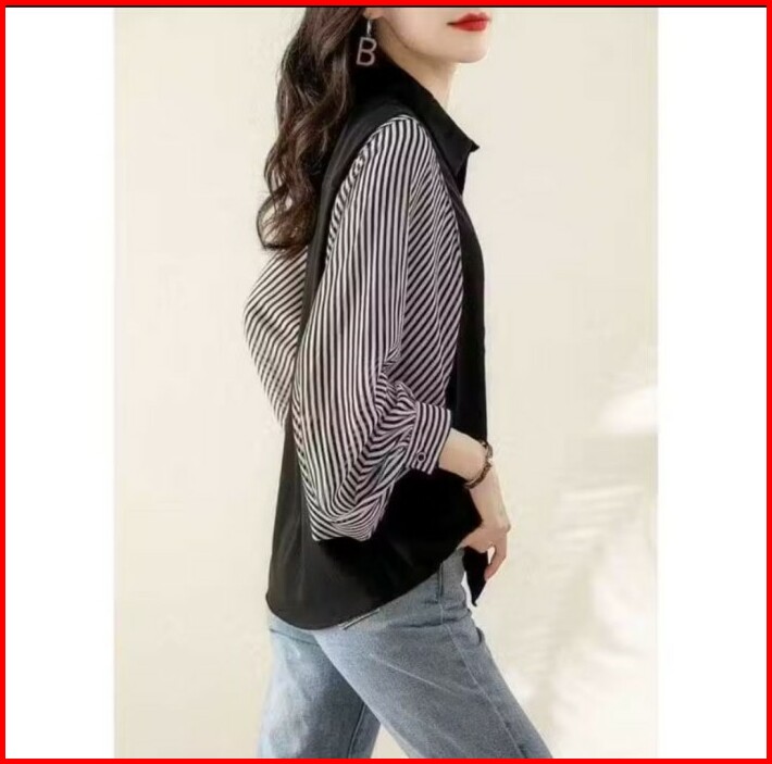 Kemeja Wanita Atasan Wanita Lengan Panjang Motif Polos Kombinasi Salur