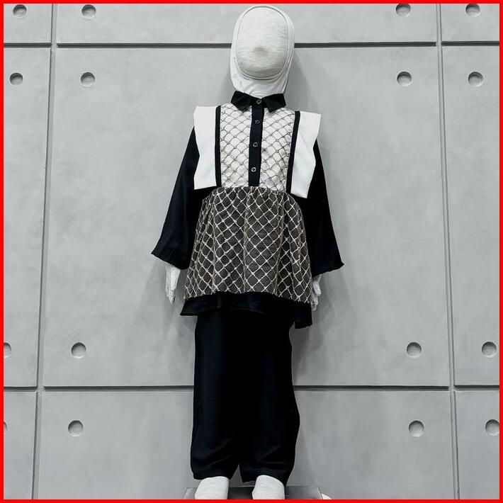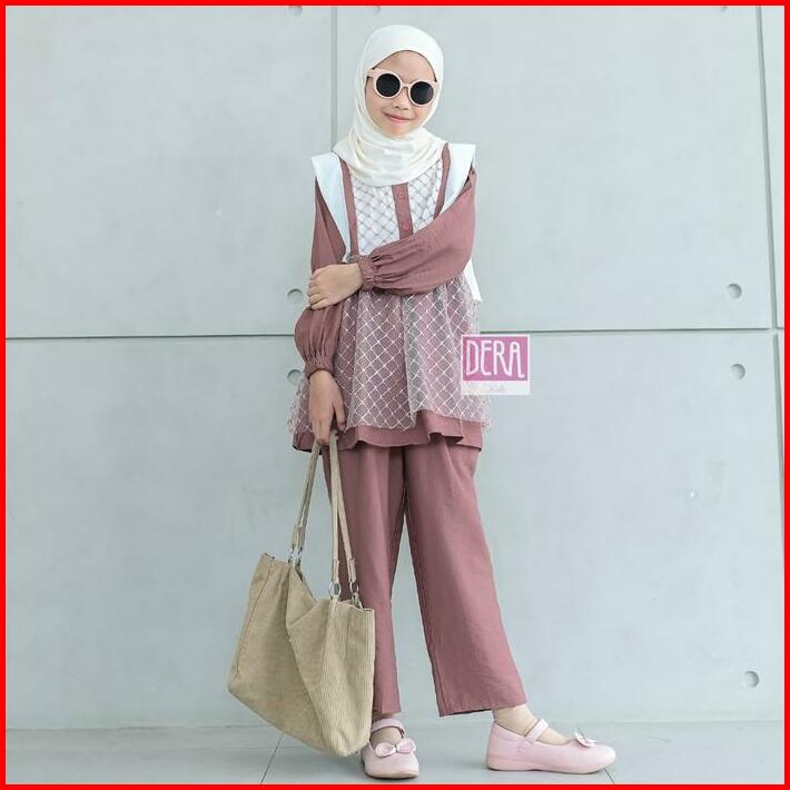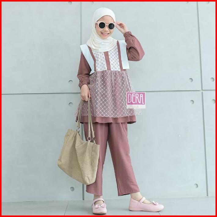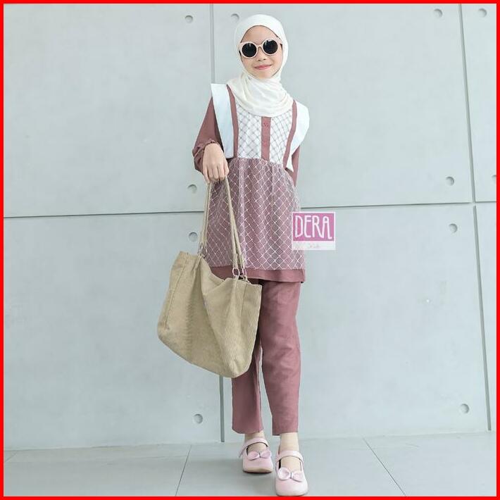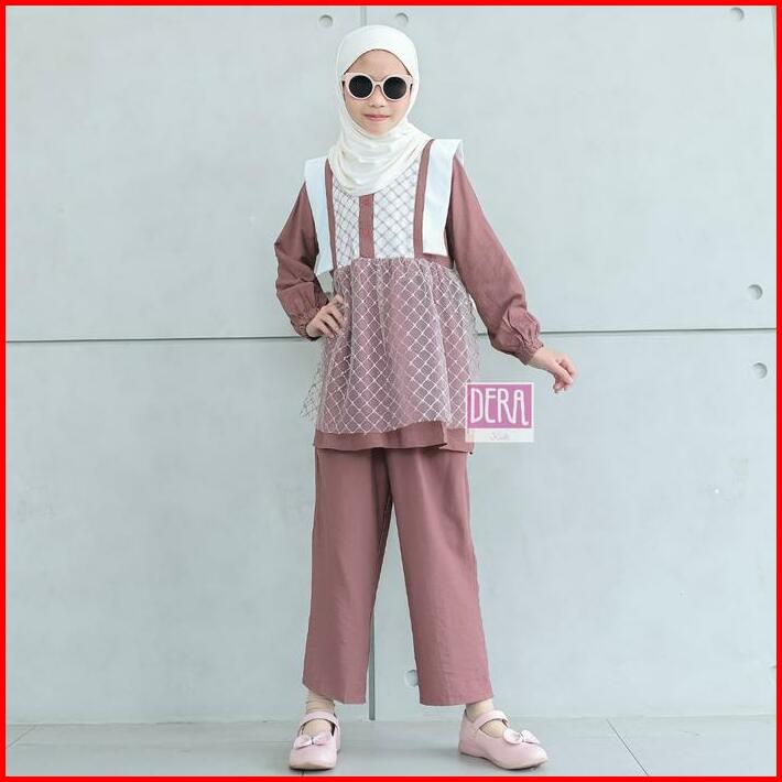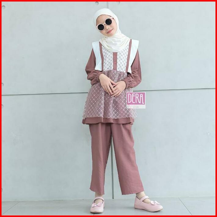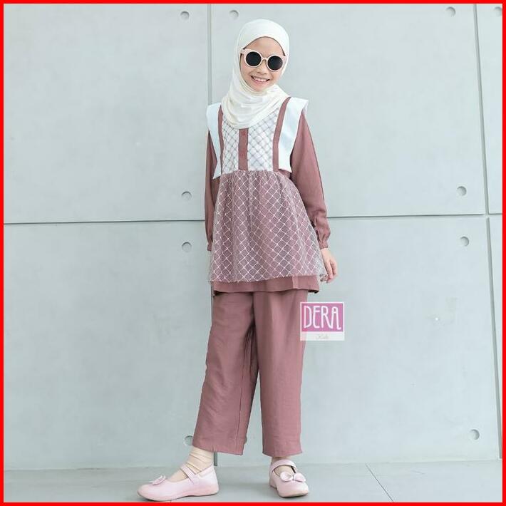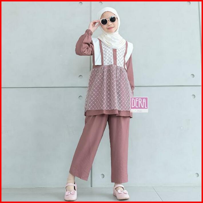 Dera Kids Kireina Dress Set Celana Panjang Bahan Linen Linica Mix Brukat Umur Usia 3 4 5 6 7 8 9 10 11 Tahun Gamis Anak