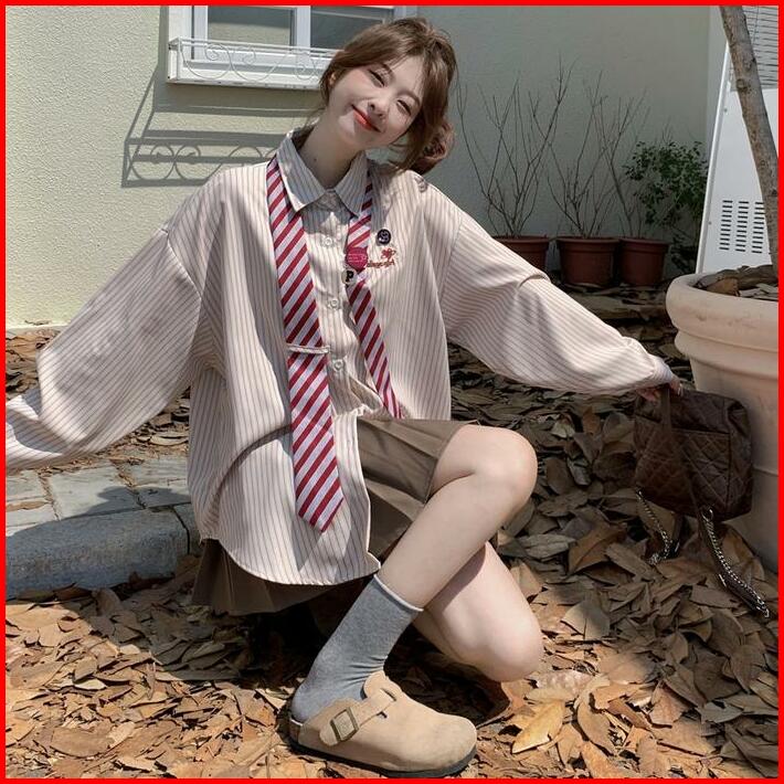 Kemeja Dasi Bergaris Korean Vintage Kemeja Wanita Loose Lengan Panjang Atasan Wanita Shirt Oversize