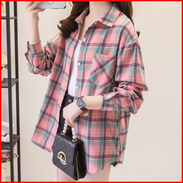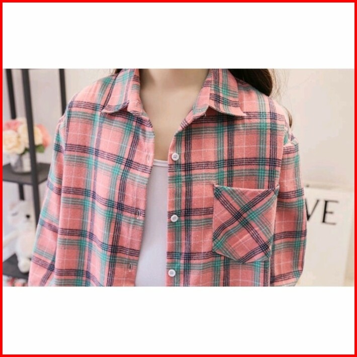 Kemeja Flannel Kotak Wanita Pink Casual Korean Look Oversize Knn