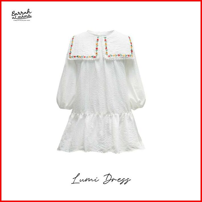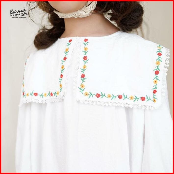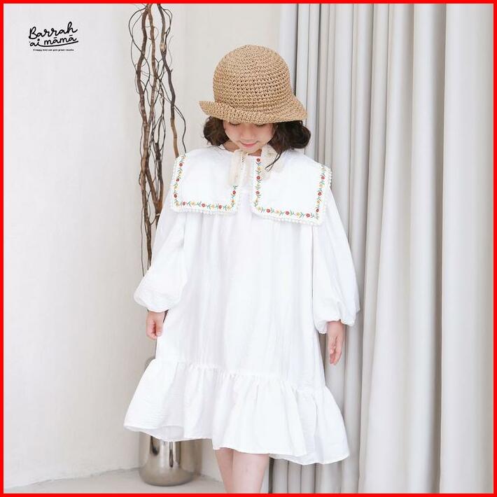 Barrahaimama Baju Dress Anak Perempuan Lengan Panjang Kerah Bordir Bunga Bahan Katun Polos Warna Putih Gamis Anak Tunik