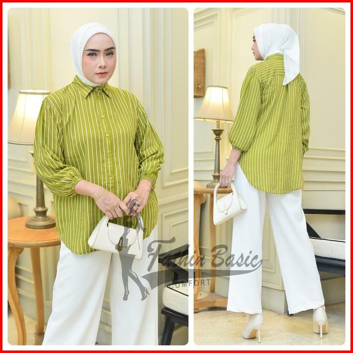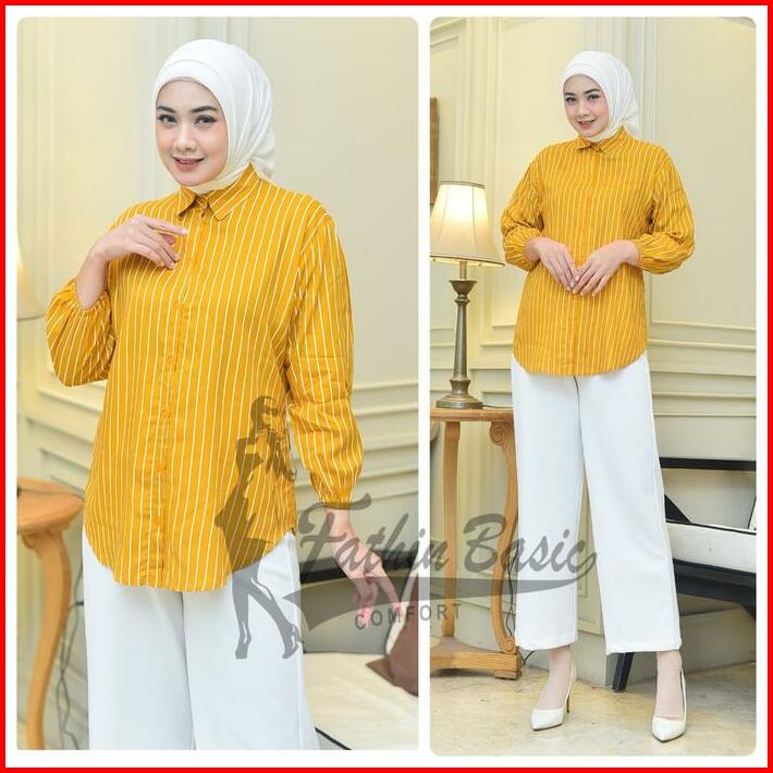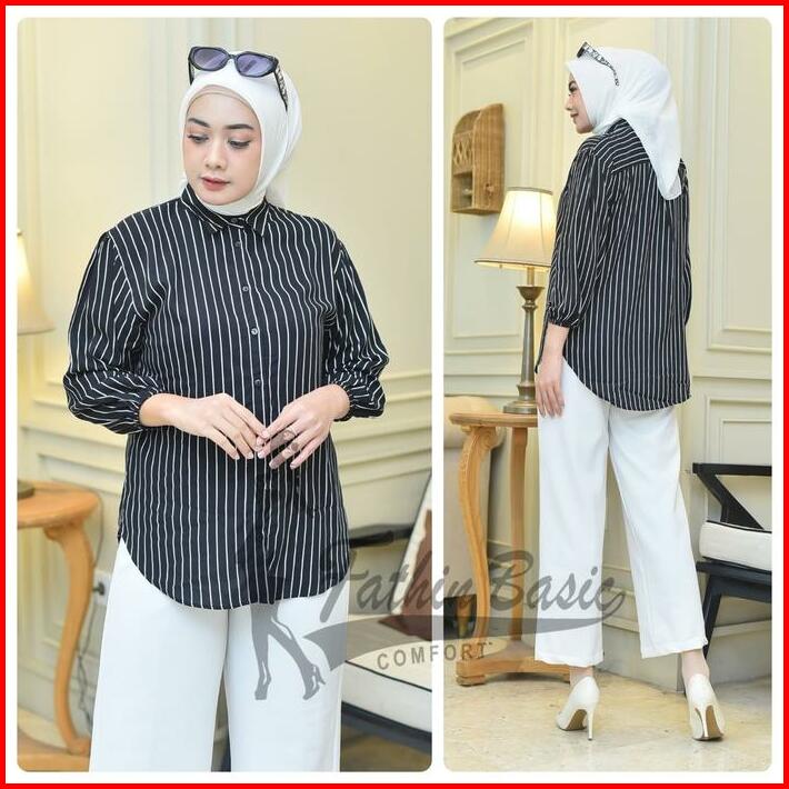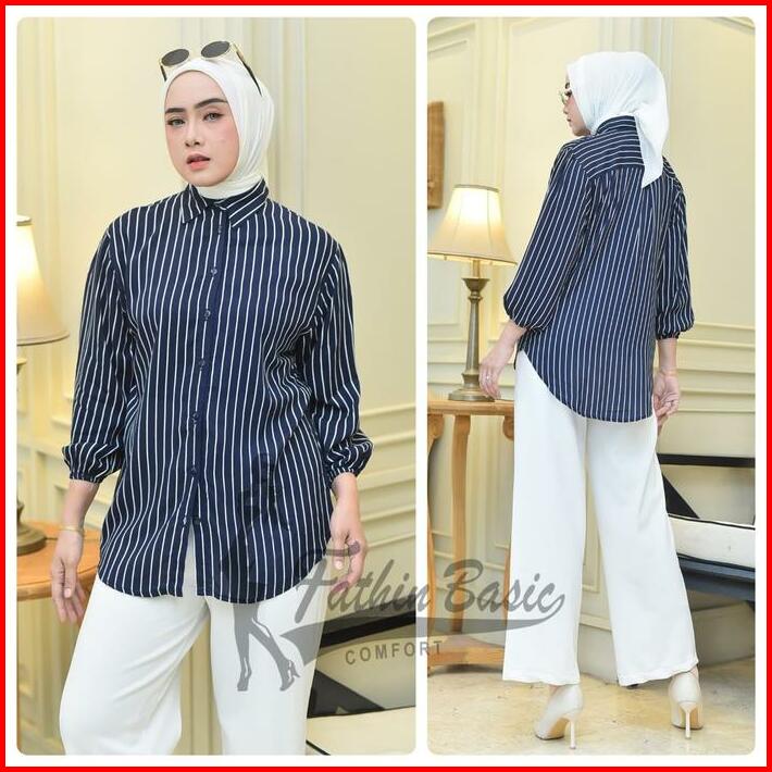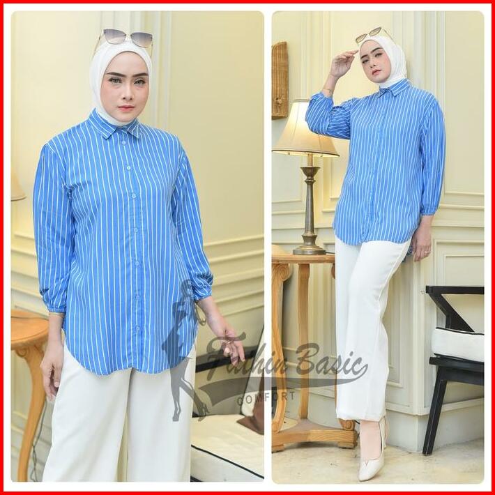 Hanifah Kemeja Salur Rayon Ld 110 120 130 140 Atasan Wanita Kekinian Oversize Lengan Panjang Baju Kancing Karet Nyaman S