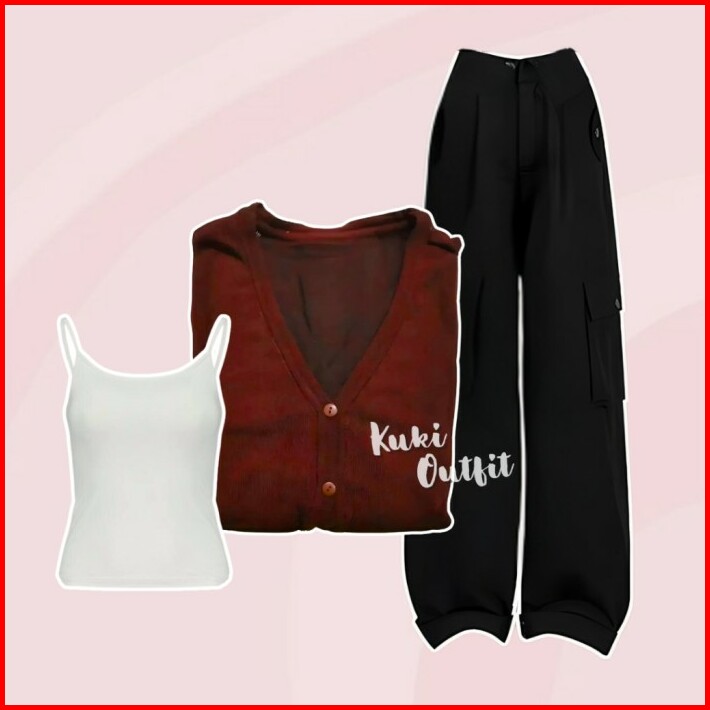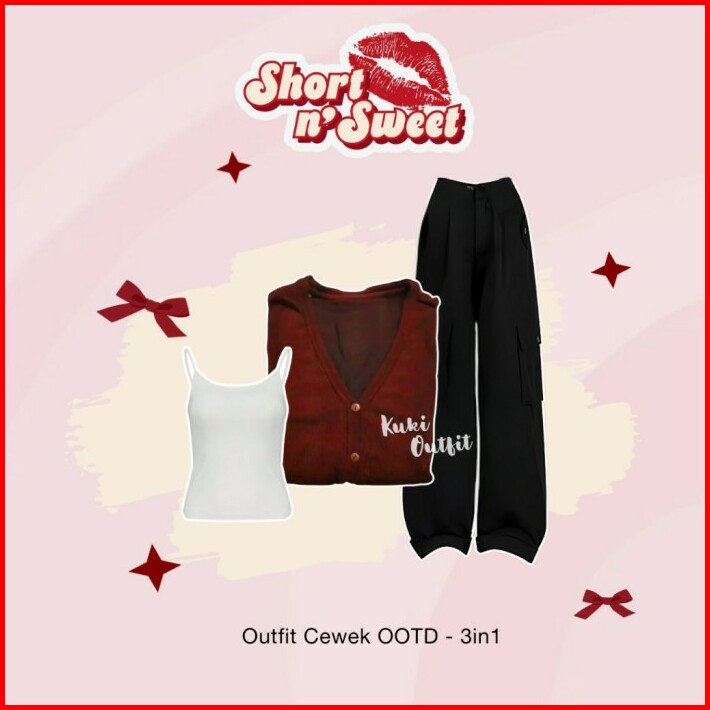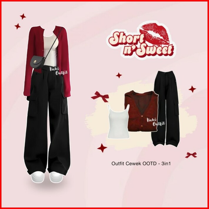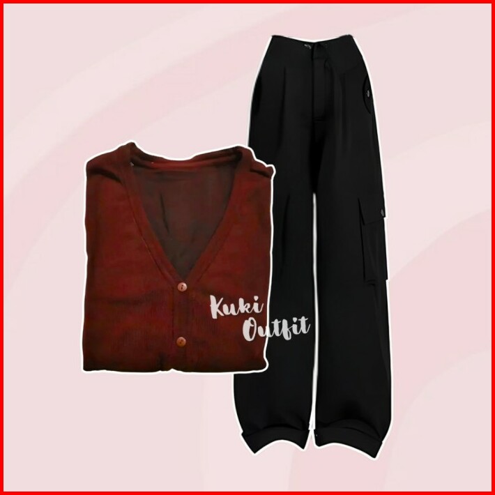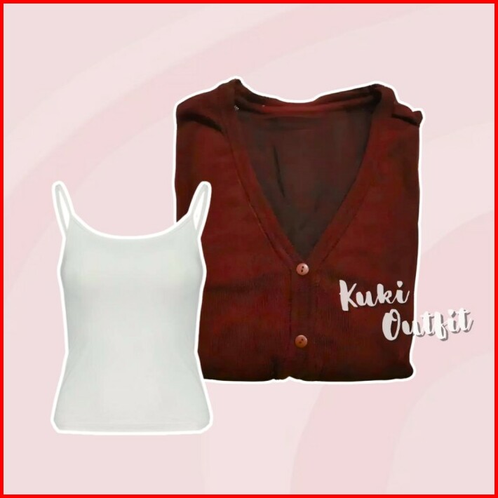 1 Set Korean Style Cardigan Celana Tanktop Rajut Ootd Outfit Natal Merah Maroon