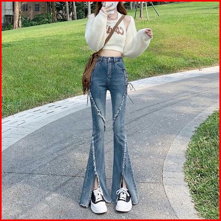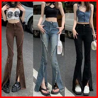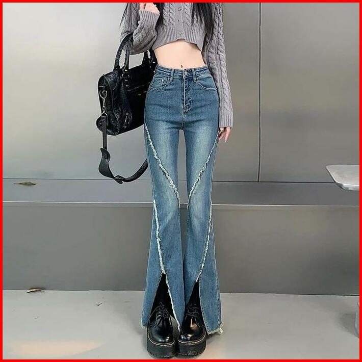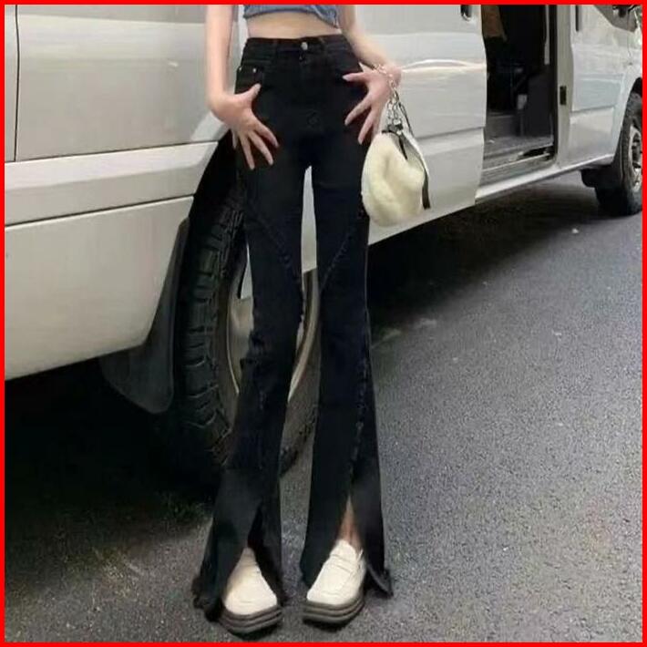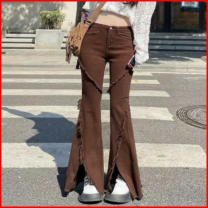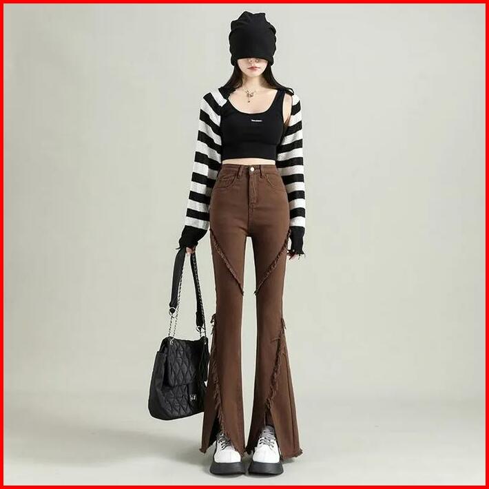 Celana Berkobar Pinggang Tinggi Wanita Pelangsing Celana Jins Berkobar Celah Retro Amerika Brown High Jeans Waist Hitam