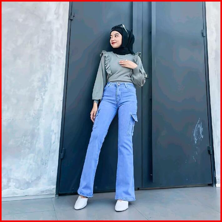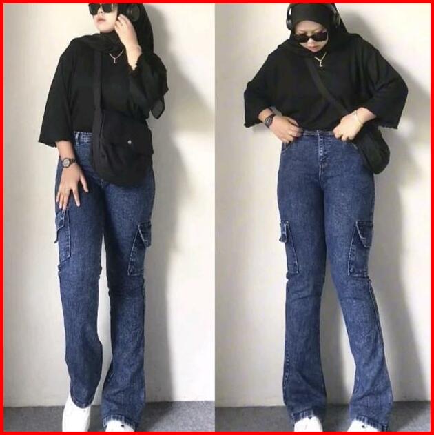 Celana Cargo Cutbray Stretch Jeans Highwaist Cutbray Cargo Jeans Wanita Polos Panjang Denim Celana Cewek Hitam