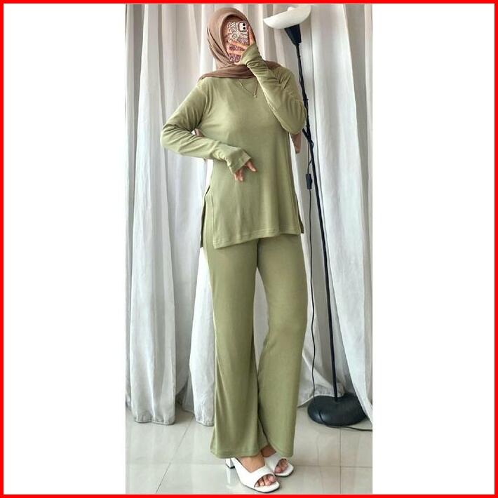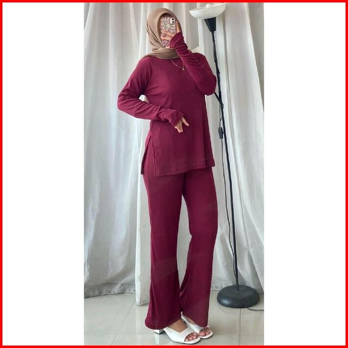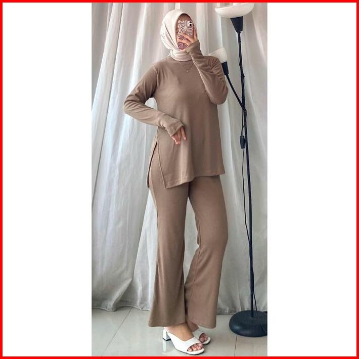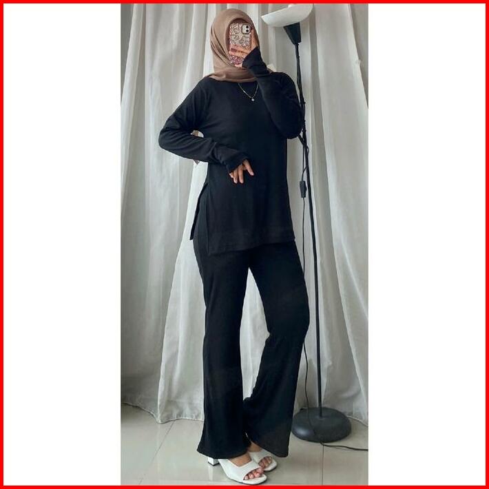 Rahms Set Knit Model Cutbray Setelan Wanita Oneset Lengan Panjang Knit Rib Shirt Pants Baju Set Celana Highwaist