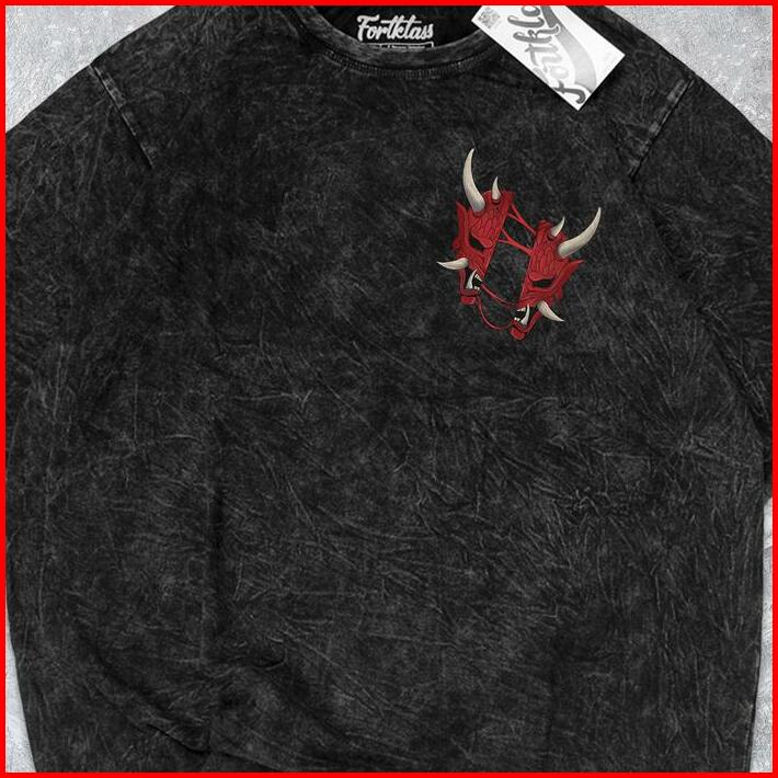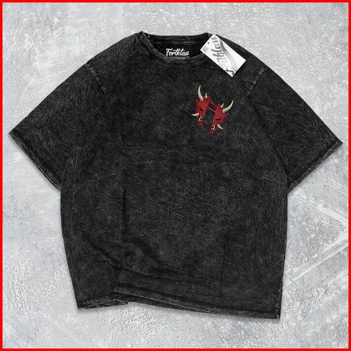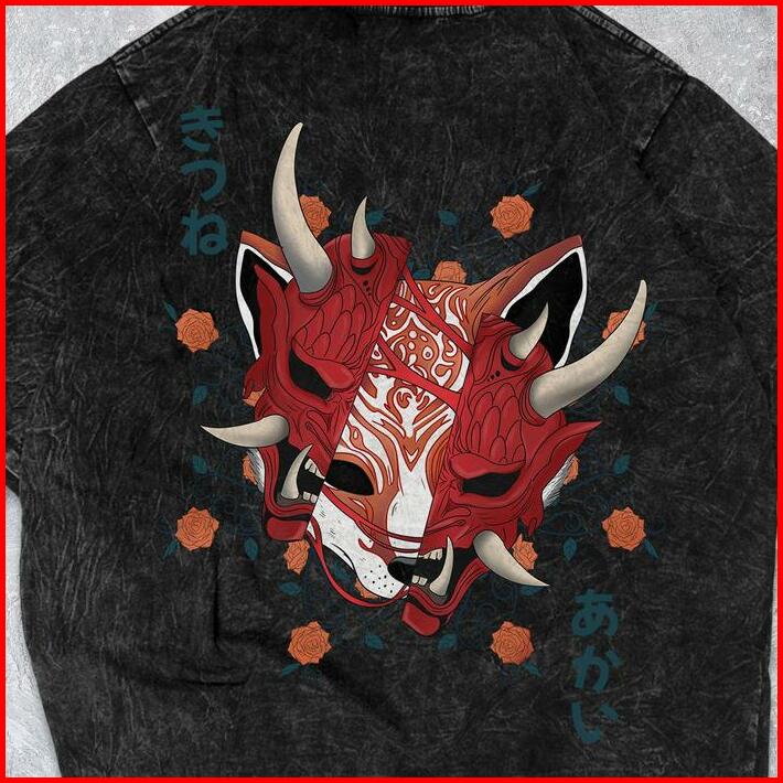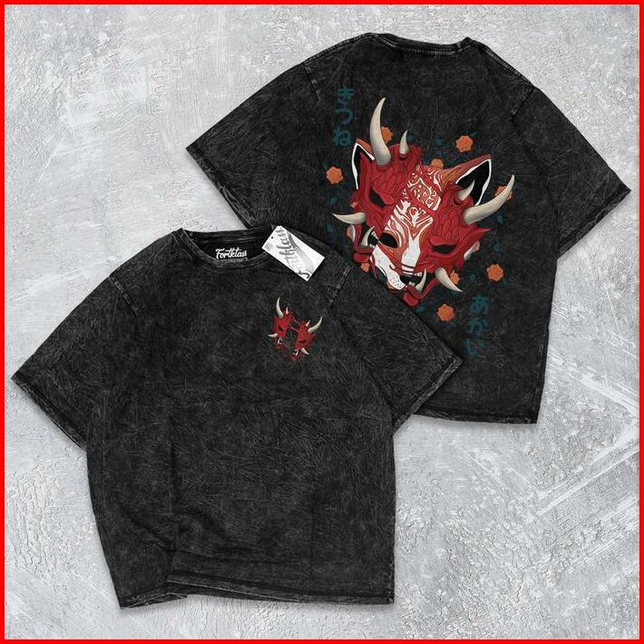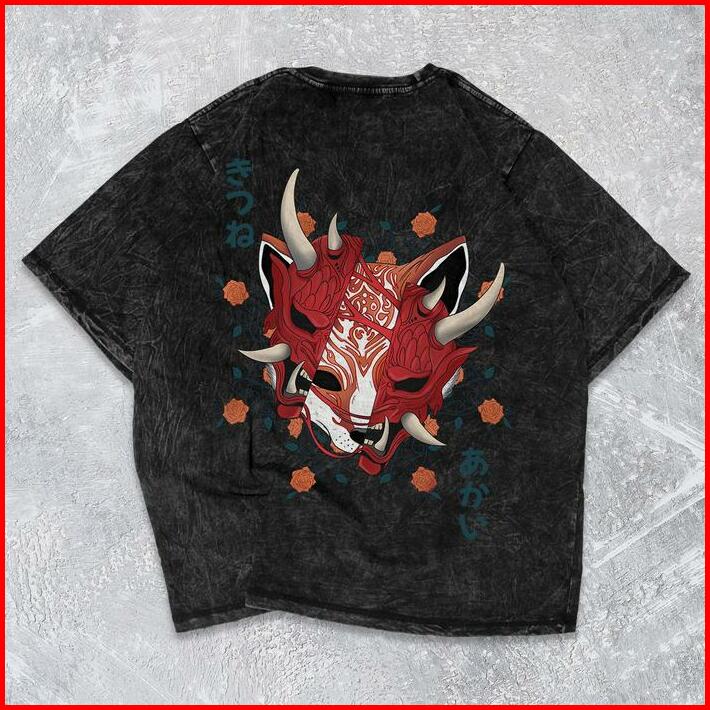 Fortklass Kaos Oversize Wash Oni Kitsune Kaos Oversize Pria Lengan Pendek Atasan Tshirt Distro Cowok Kaos Pria Kaos Polo