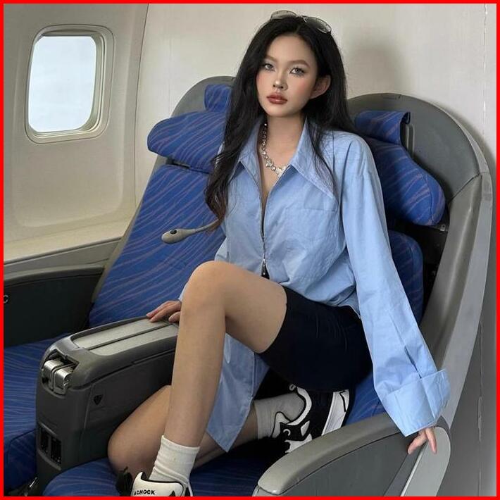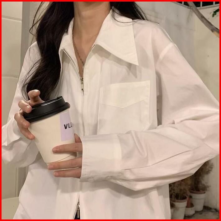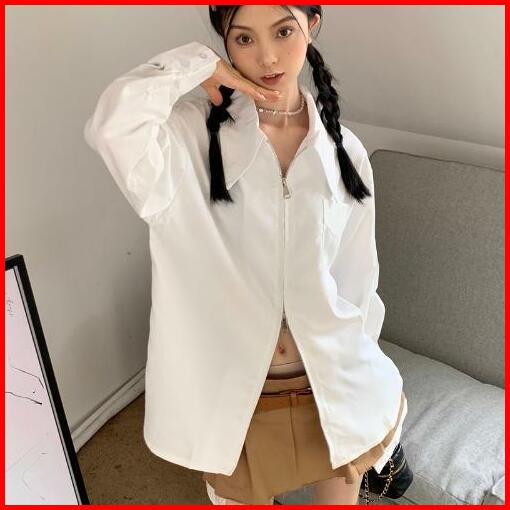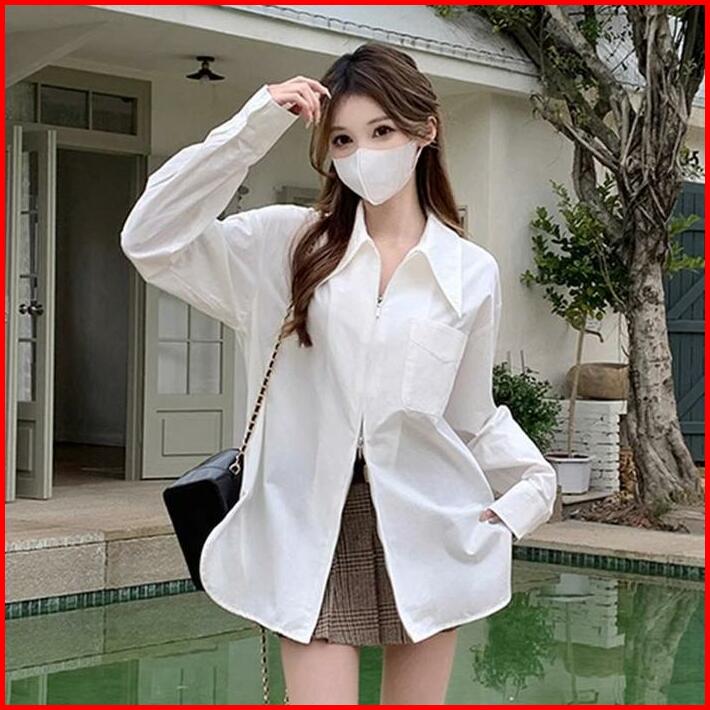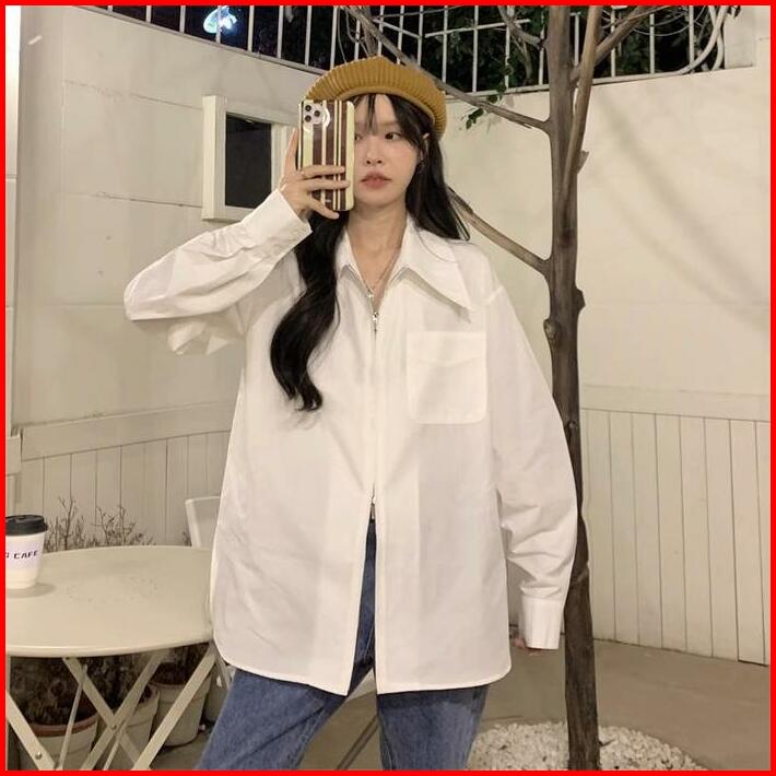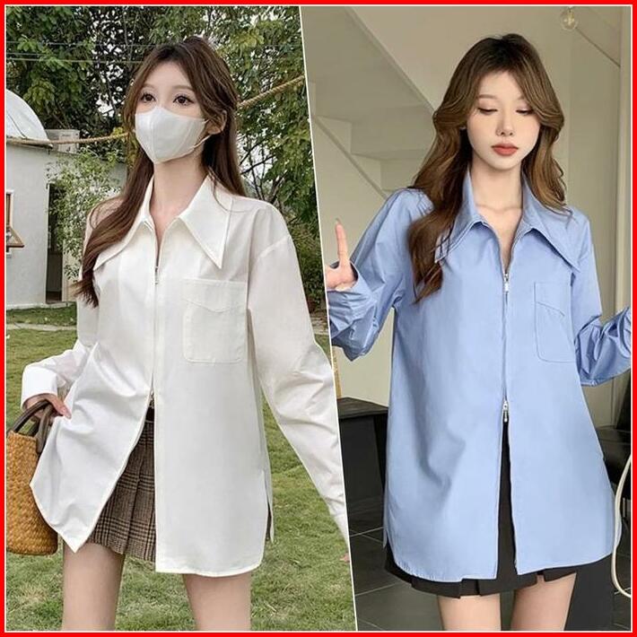 W263 Kemeja Wanita Lengan Panjang Resleting 2 Arah Kemeja Wanita Oversize Gaya Korea