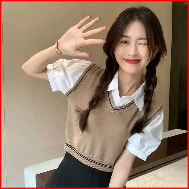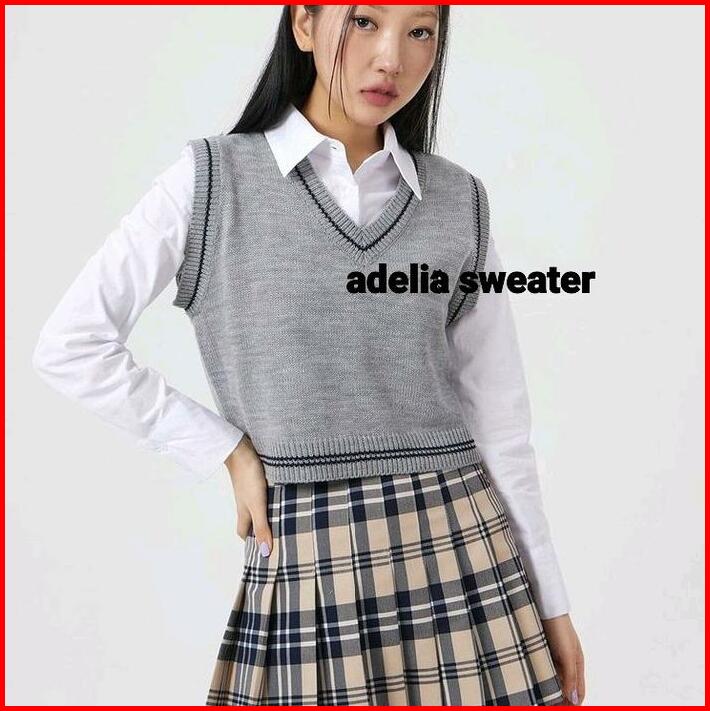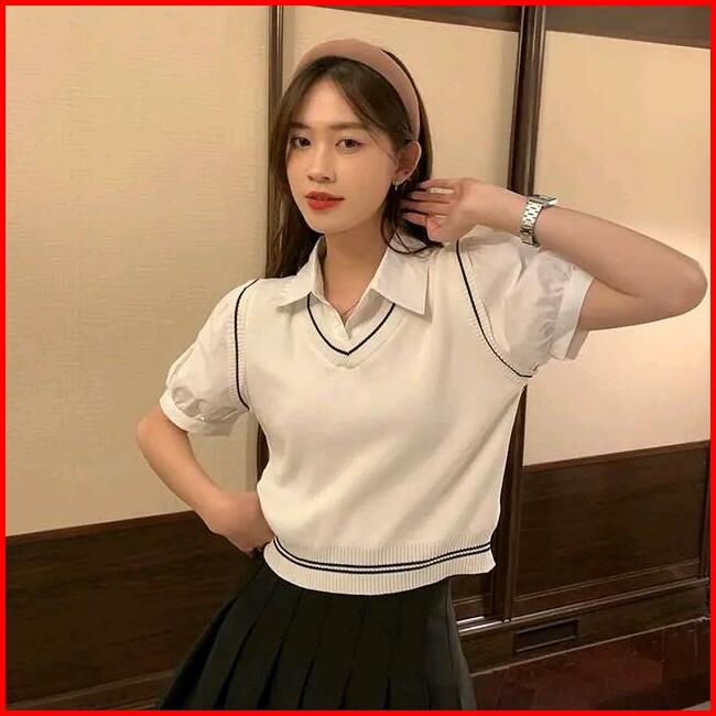 Rompi Rajut Wanita Atasan Blouse Setripe Crop V-neck Polos Vest Korean Style Panjang Top Basic Hitam