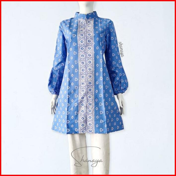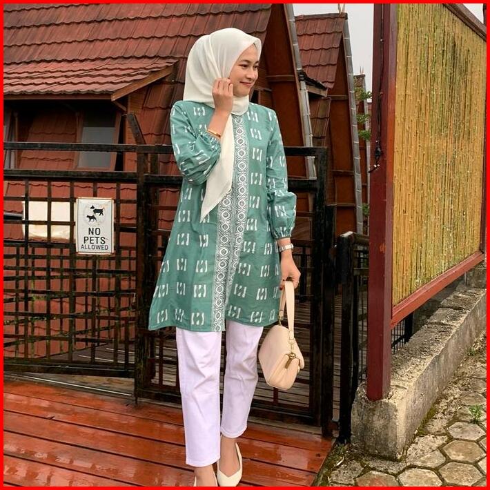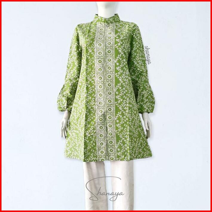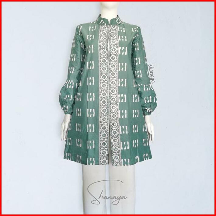 Shanaya Baju Atasan Batik Wanita Tunik Lengan Balon Sage Green Zipper Depan Blouse Elegan Di Pakai Untuk Kerja Kuliah