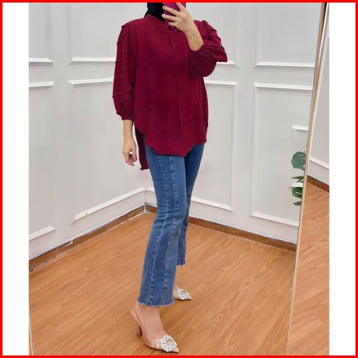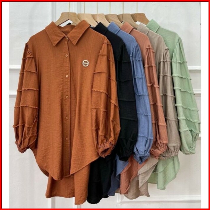 Kemeja Kerja Atasan Wanita Big Size Rempel Lengan Polo Linen