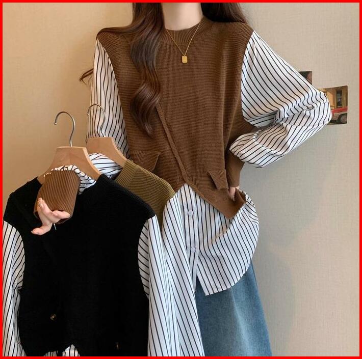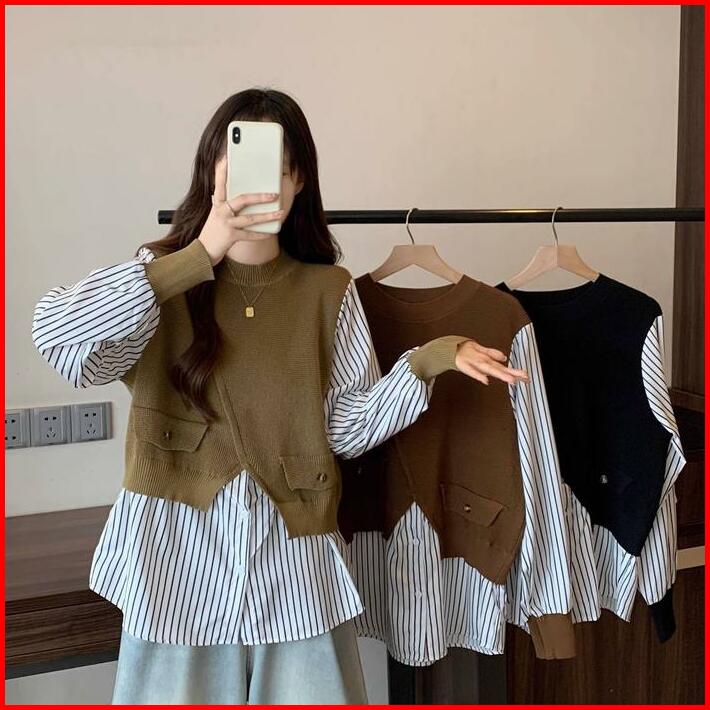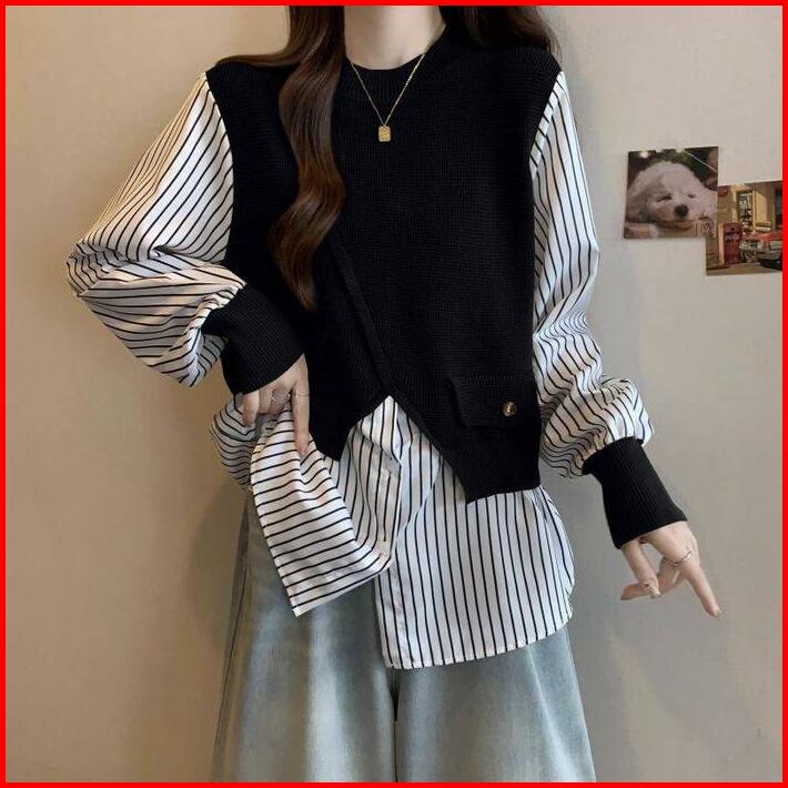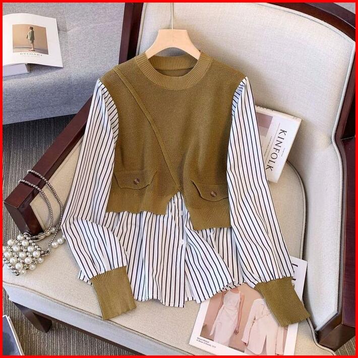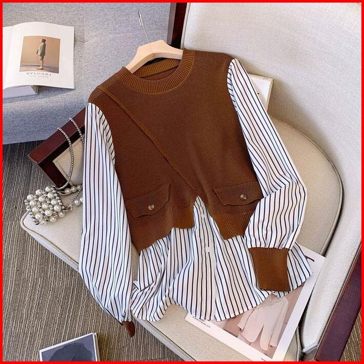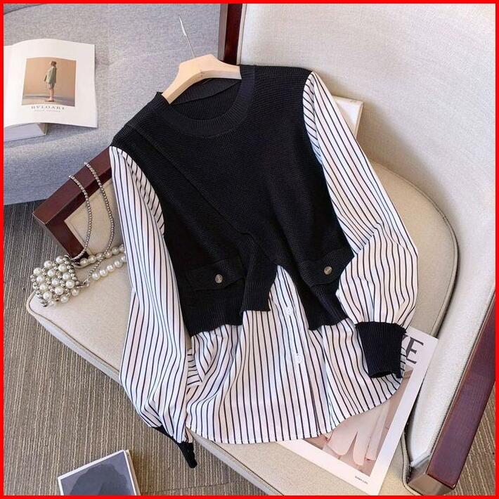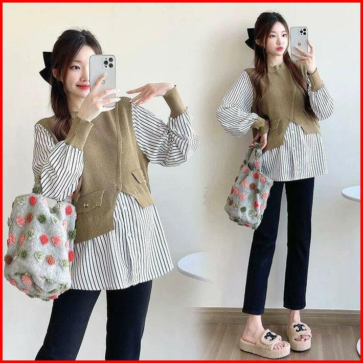 Gloryshop88 Atasan Kemeja Blouse Wanita Polos Salur Blouse Vest Korean Model Vest Kemeja Rajut Rajut Korean Style Fashio