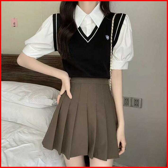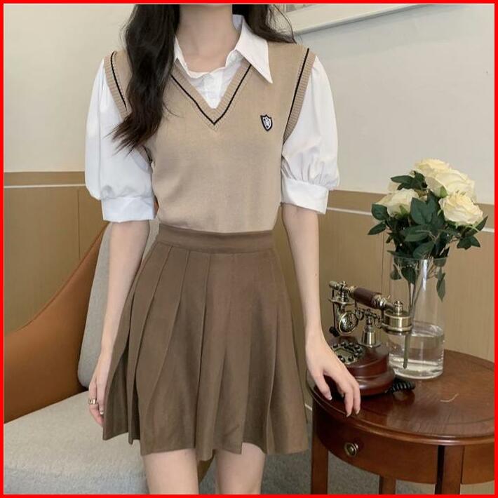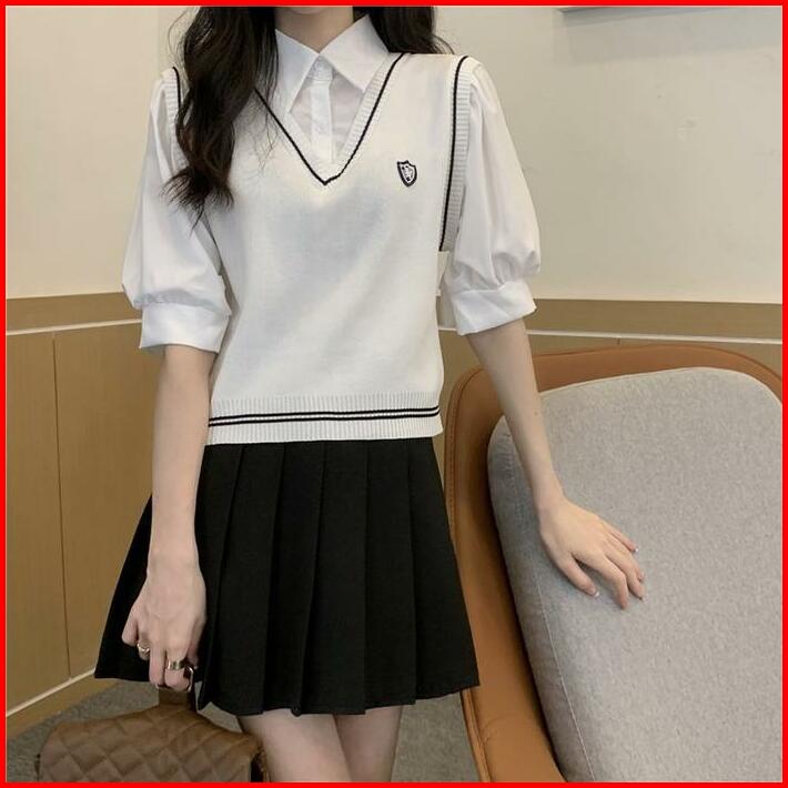 Yeppeo Bj1658 Atasan Rajut Kerah Knit Rajut Blouse Set Vest Shirt Korean Lengan Pendek Baju Katun