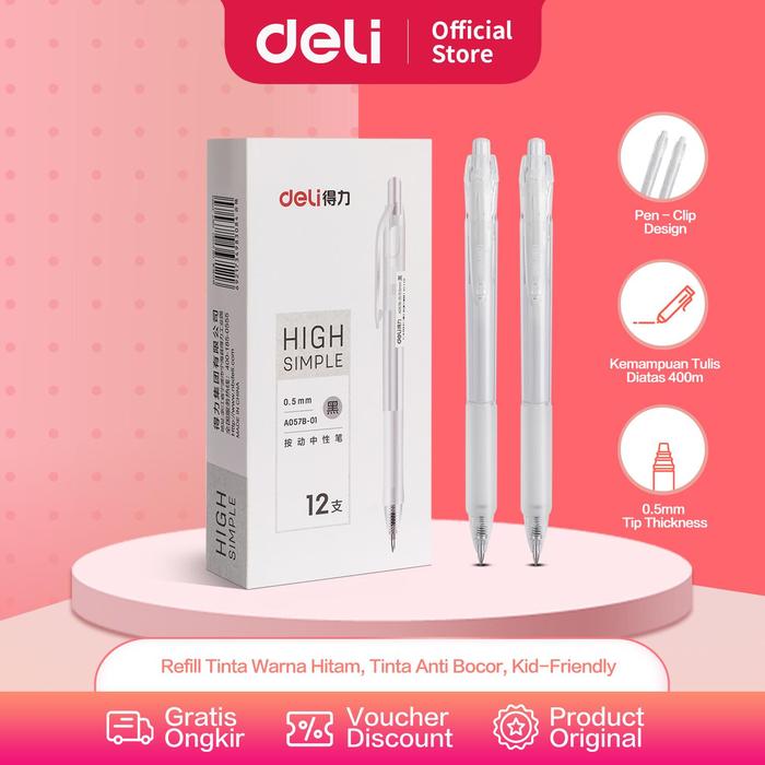 Deli Gel Pen Pulpen Gel Retractable Tinta Hitam 0.5mm A057B-01 Alat Putih Transparan Tulis Stationery - 6pcs, Standar