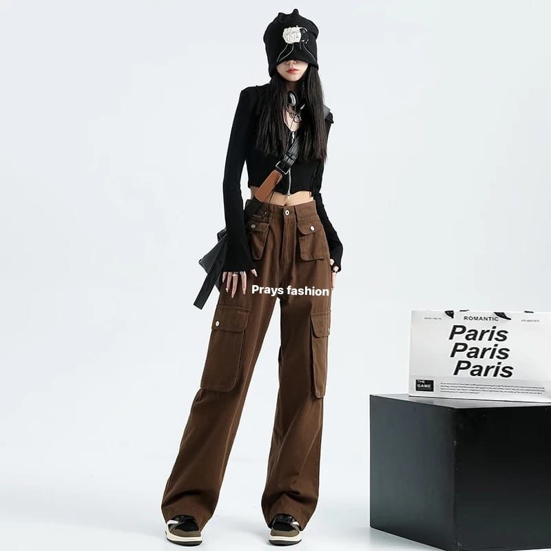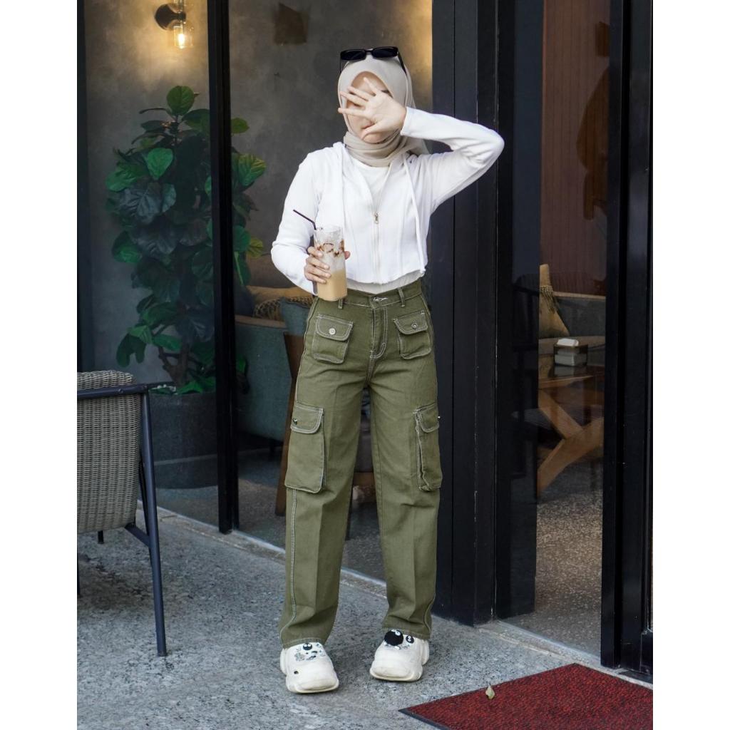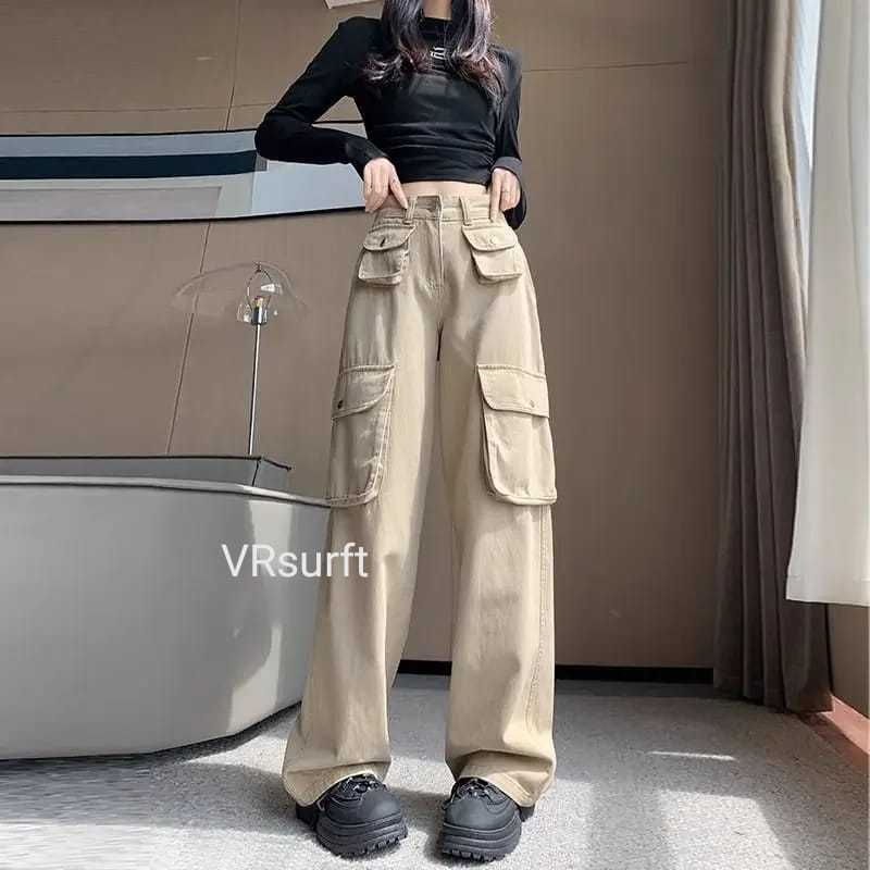 (Gratis Ongkir) Prays Fashion - Cargo Denim Pasir Putih Highwaist Loose Celana Jeans Wanita Korea(realpict)