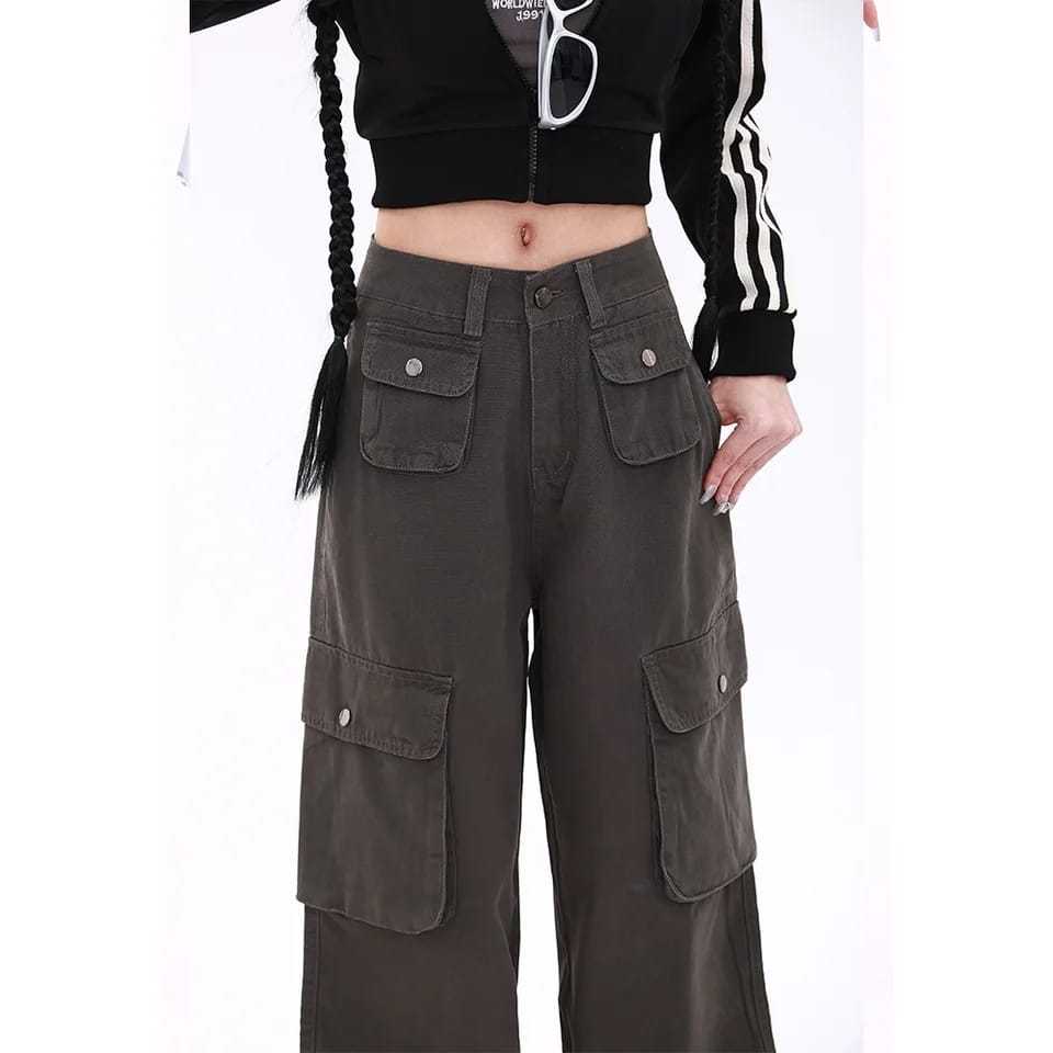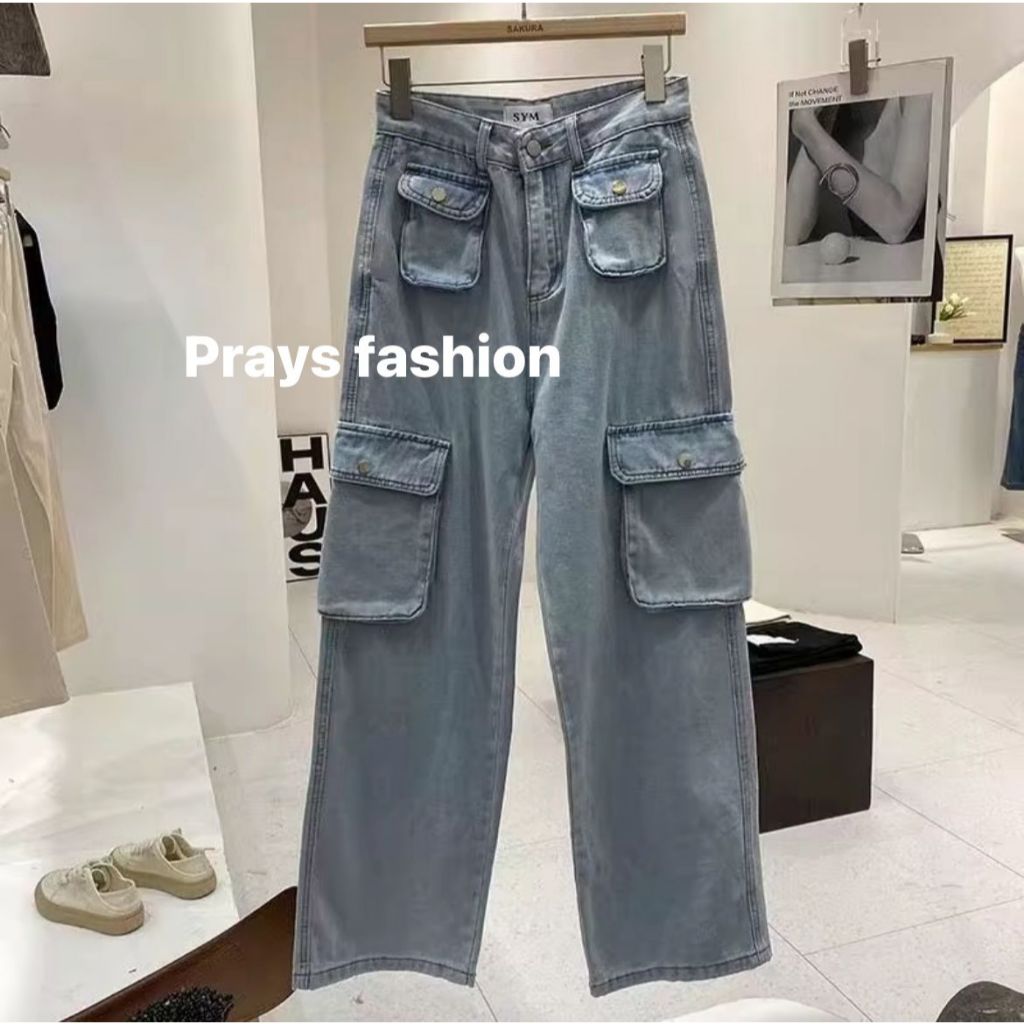(Gratis Ongkir) Prays Fashion - Cargo Denim Pasir Putih Highwaist Loose Celana Jeans Wanita Korea(realpict)