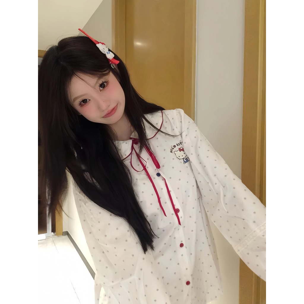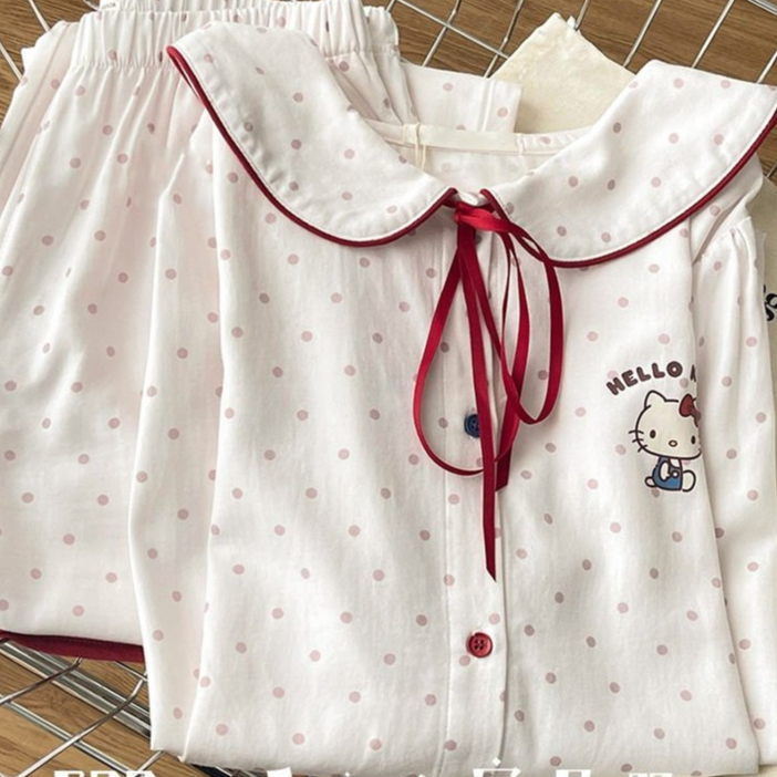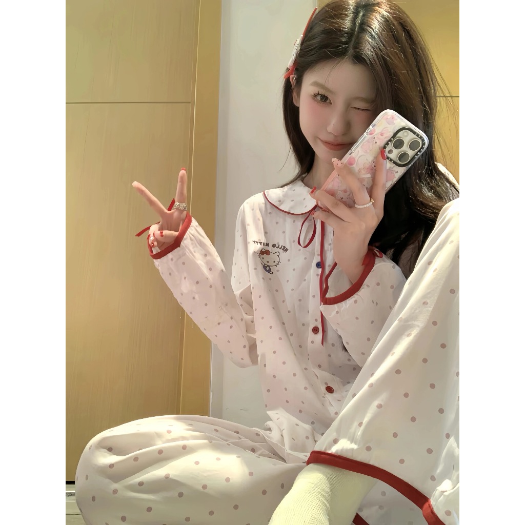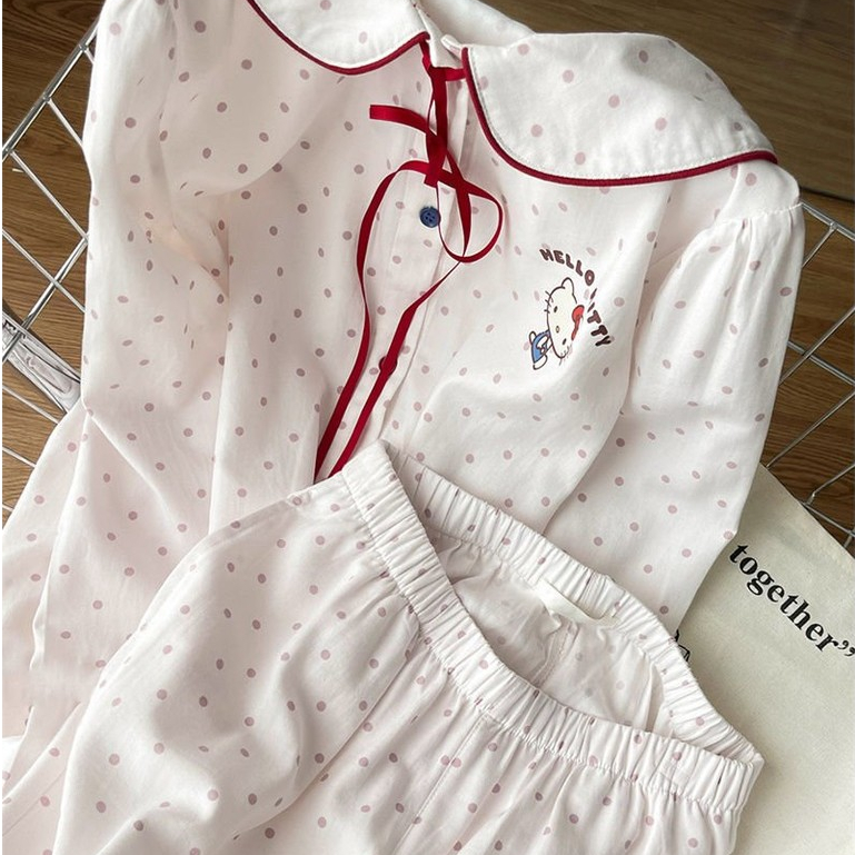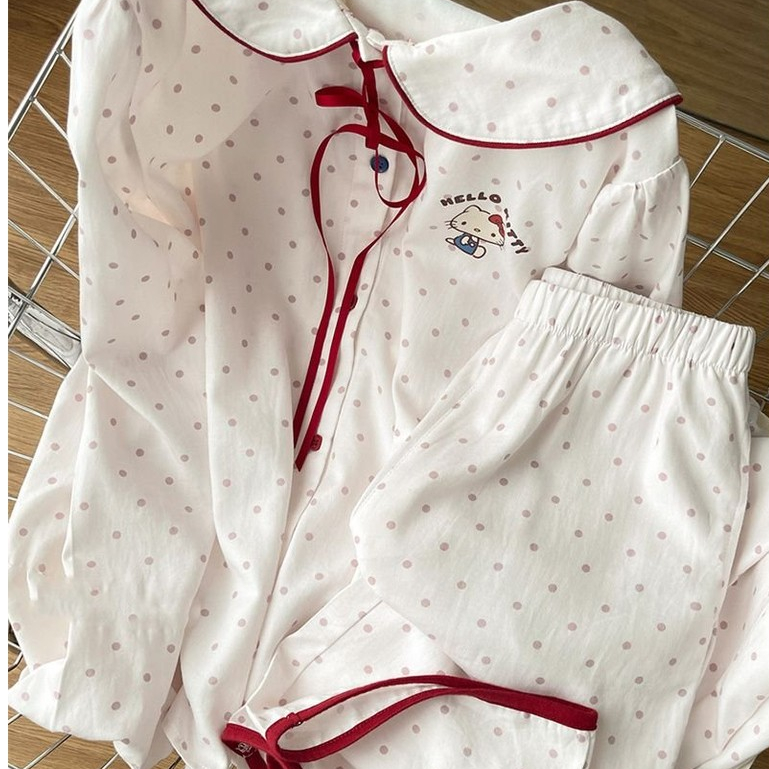【Ready】Polkadot Hello Kitty Piyanma Wanita Gaya Kartun Jepang Siswa Pakaian Rumah Luar Pajama Set