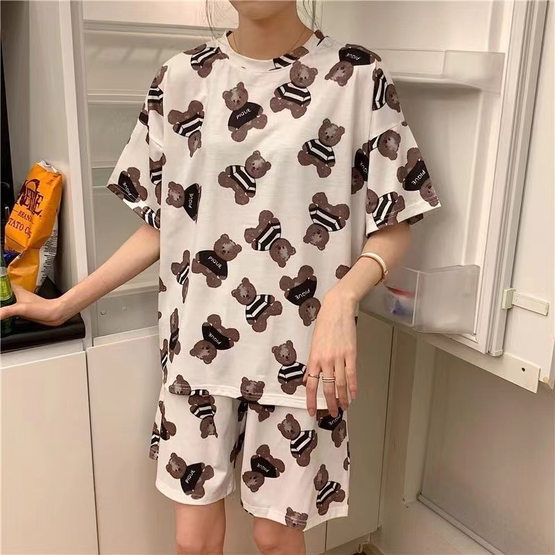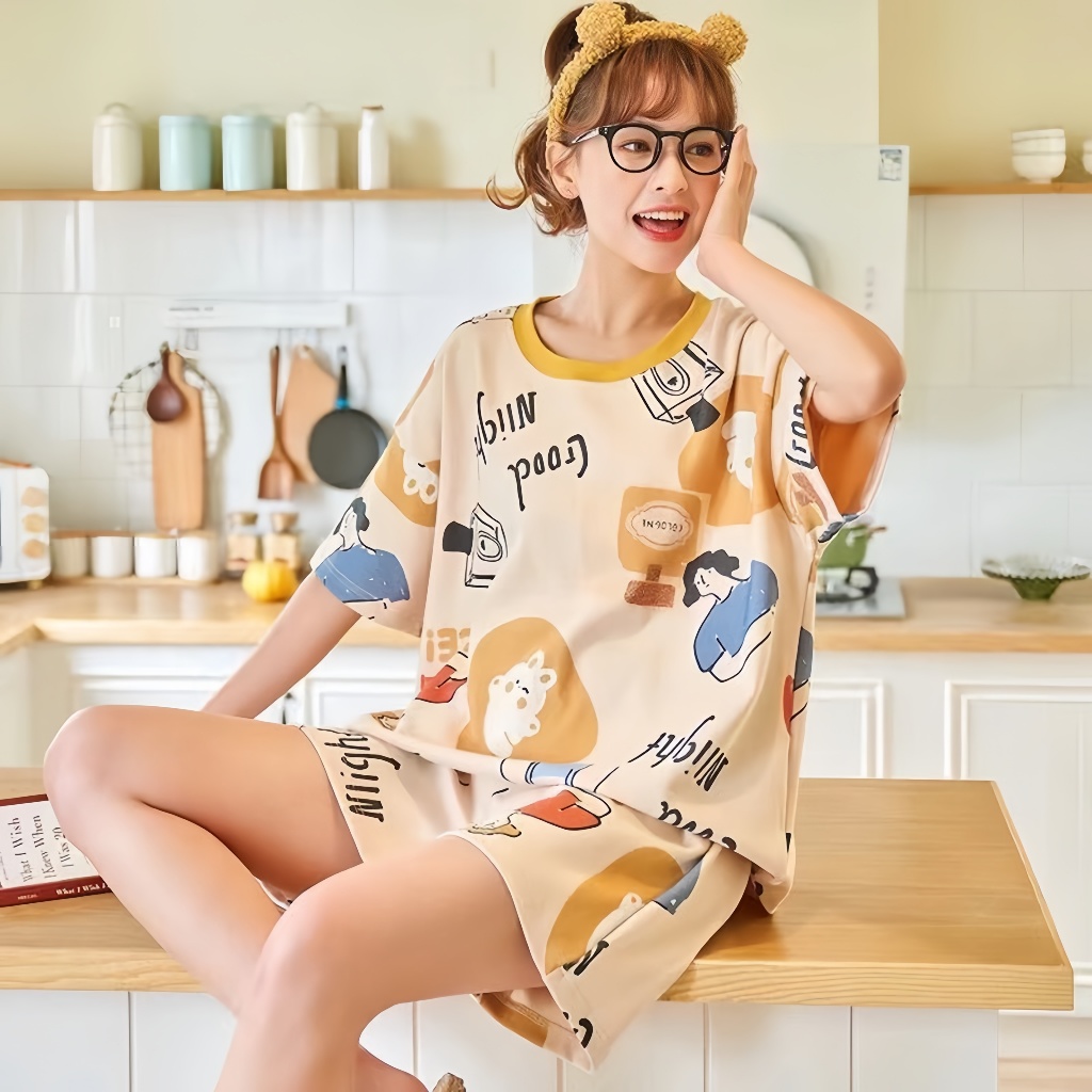 Set Piyama Kartun Imut - Atasan Lengan Pendek + Celana Pendek Desain Rumahan Elegan Nan Menggemaskan! Setelan Tidur Bern