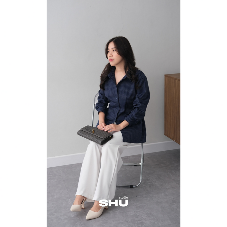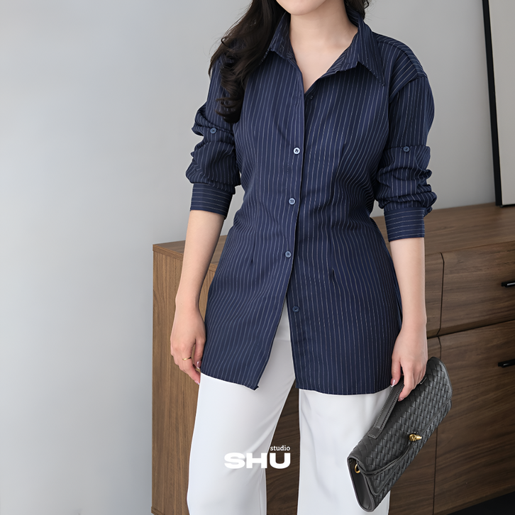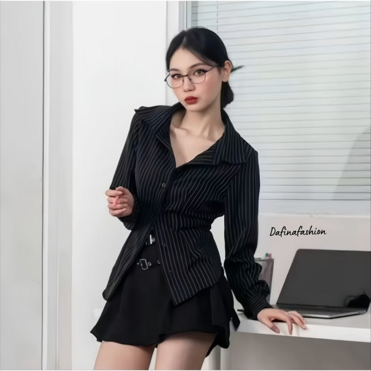 Kemeja Salur Wanita Press Body Kemeja Wispie Slimfit Dengan Tali Adjustable Termurah
