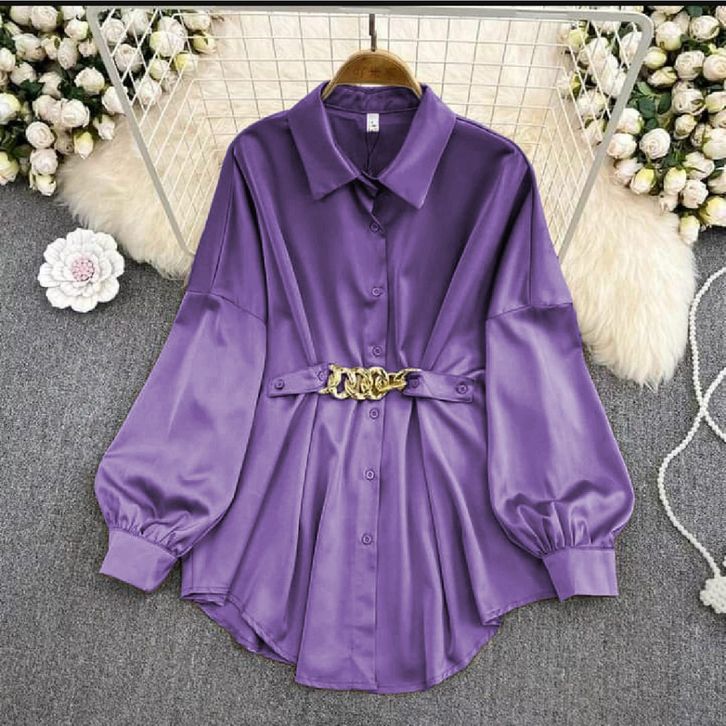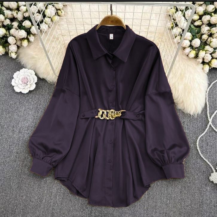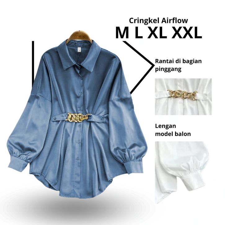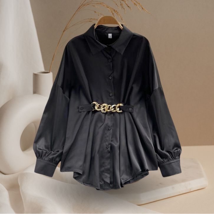 Kemeja Wanita Polos Motif Rantai Lengan Balon Blouse Atasan Full Kancing Korean Style Oversize Jumbo