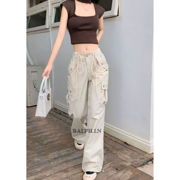 celana panjang cargo jogger tali serut wanita highwaist loose model terbaru paling trending kekinian model korean