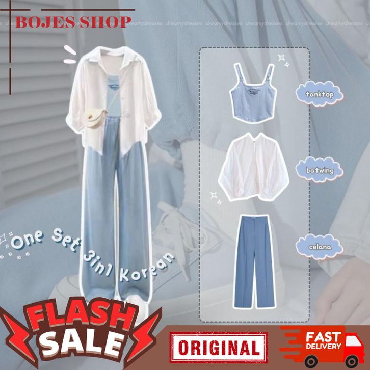 3in1 Set 55 - OOTD PREMIUM One Set Setelan Korean Style kemeja Batwing Oversize Celana Kulot Crinkle Highwaist Loose