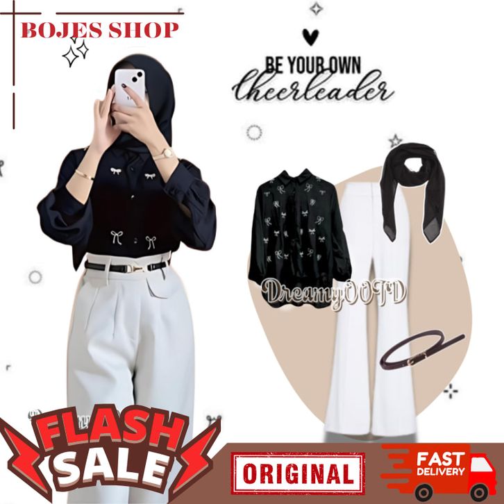 DreamyOOTD - One Set Hijab Korean Style Wanita Remaja Baju Setelan Wanita Kekinian– Hijab Blouse Celana Cutbray Belt –
