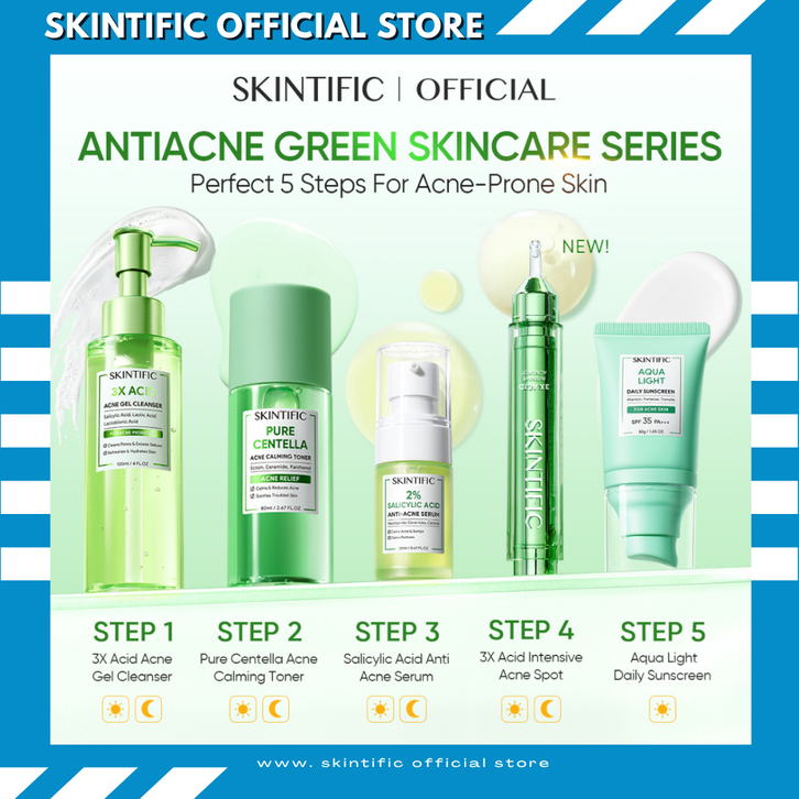 SKINTIFIC OFFICIAL STORE Green Series Anti Acne Set 5-in-1 Bundle Merawat Jerawat Paket 3X Acid Cleanser 2% Salicylic Ac