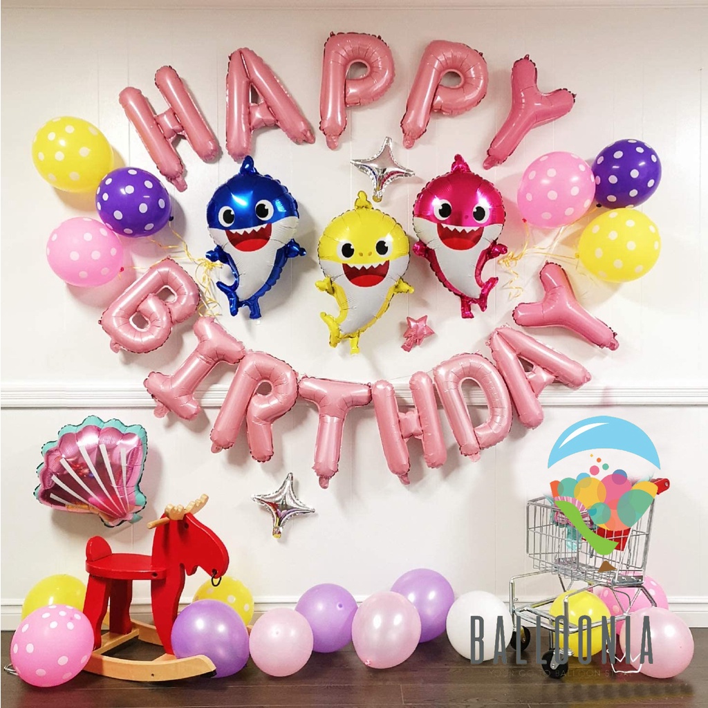Set Balloon Happy Birthday Baby Shark Pink Polkadot / Dekorasi Balon Ulang Tahun Anak Perempuan / Lucu