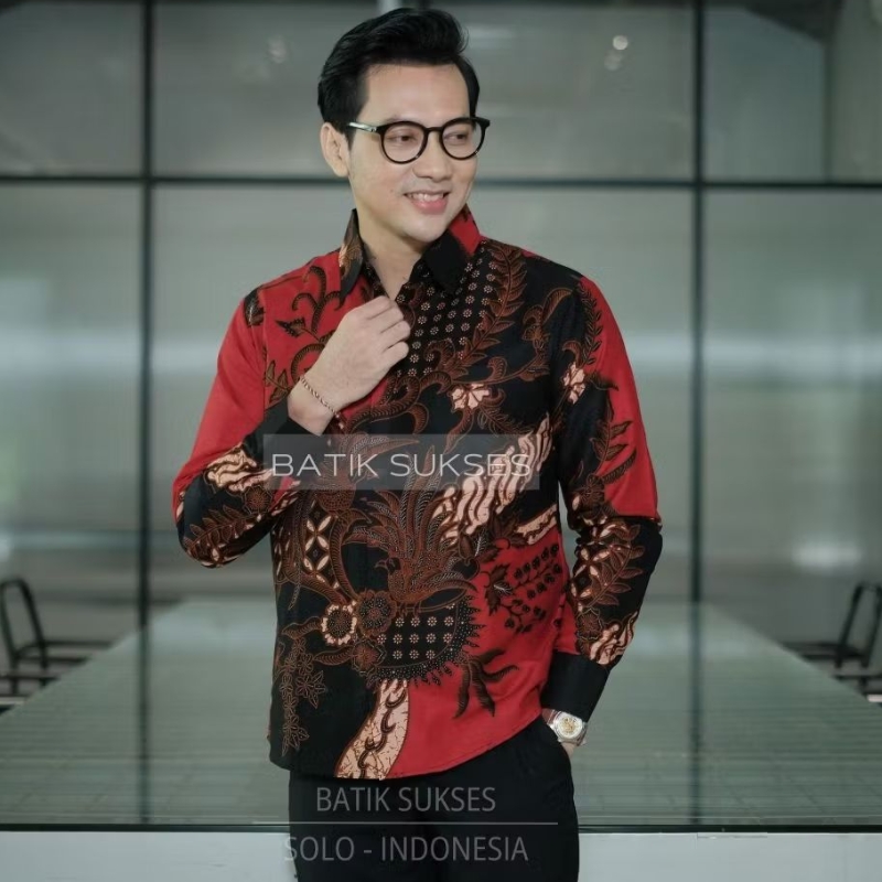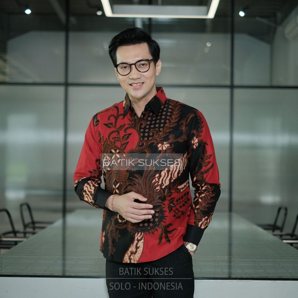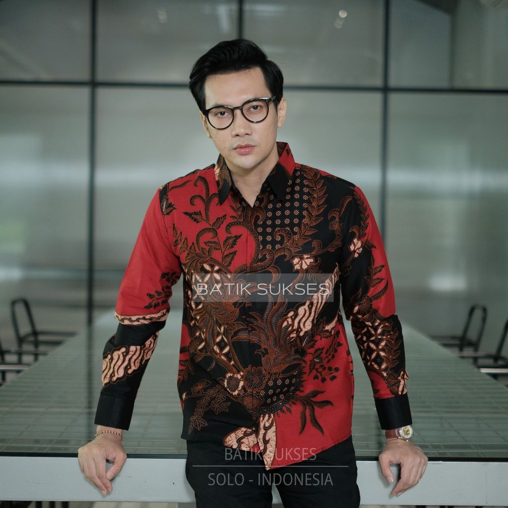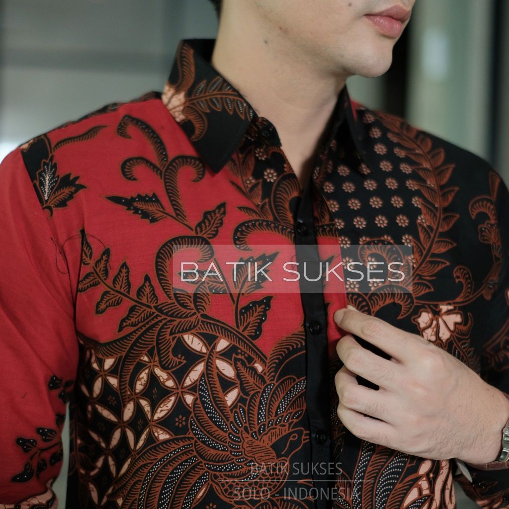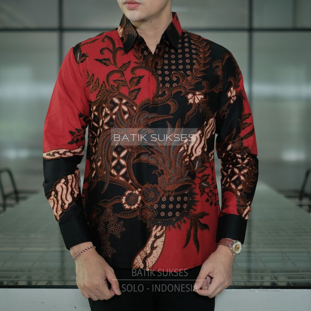 JAYANEGARA Kemeja Batik Pria Slimfit Lengan Panjang Katun Halus FULL FURING Batik Solo Merah Hitam
