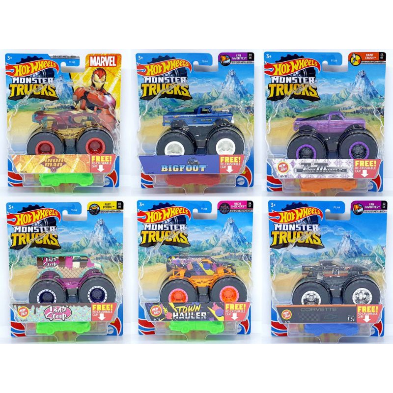 1 Bad Scoop, Bigfoot Biru, Rodger Ramcharger, Podium Crasher Lacus, Land Rover Greedy, Jeep Falken, VW Beatle Momo, Too scool, Mega Wrex, Dodge Charger F&F, Ford Raptor, Nacho Mammas, Turtles Leonardo, Bigfood Lumpur, VW Beatle, Chevy Silverado, Drag Bus TH, Battitude, Triceratops, Bear Devil, JEEP, Bus Lightyear, Bone shaker, Bete, Velociraptor Blue, Indoraptor, Giganotosaurus, Corvette, Delivery, Carbonator, Masters Skeleton, Piran Ahhhh, BONE SHAKER SILVER, Snake, Gunkster, Podium Crasher, Thanos, Rodger Dodger, Master Battle Cat, Tri To Crush Me, Town Hauler Color, Rodger Dodger Color, Will Trash It All, Bigfood, Steer Clear, Bread Boyz, Good Luck Trolls, Board Wild, Land Rover, 5 Alarm, Back Future