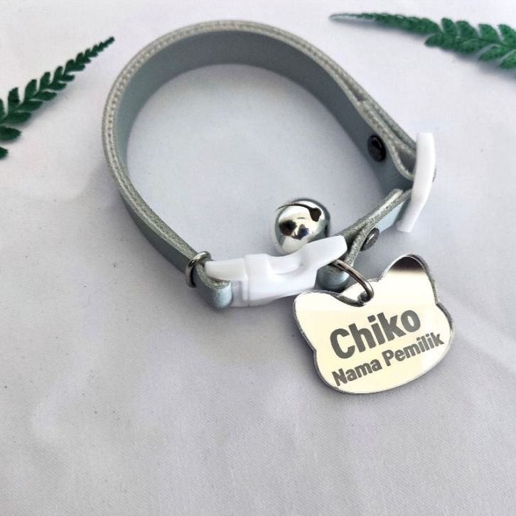 Kalung Kucing Custom Nama Gratis Ukir Nama Motif Kepala Kucing Bahan Liontin Akrilik Silver