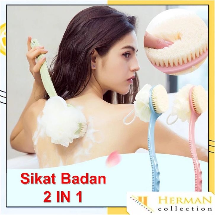 Sikat Mandi Dua Sisi Spon Bulu Lembut Gagang Panjang Shower Puff + Sikat Gosok Punggung 2 in 1 Penghilang Daki Bersih