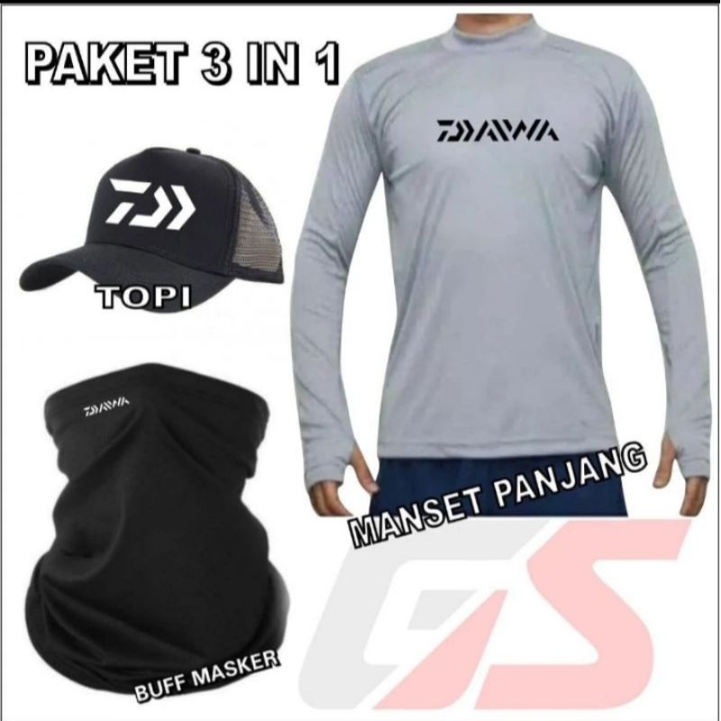 Paket hemat 3 in 1 Lengkap Topi Mancing, Buff Masker Mancing Dan Jersey Daiwa super murah
