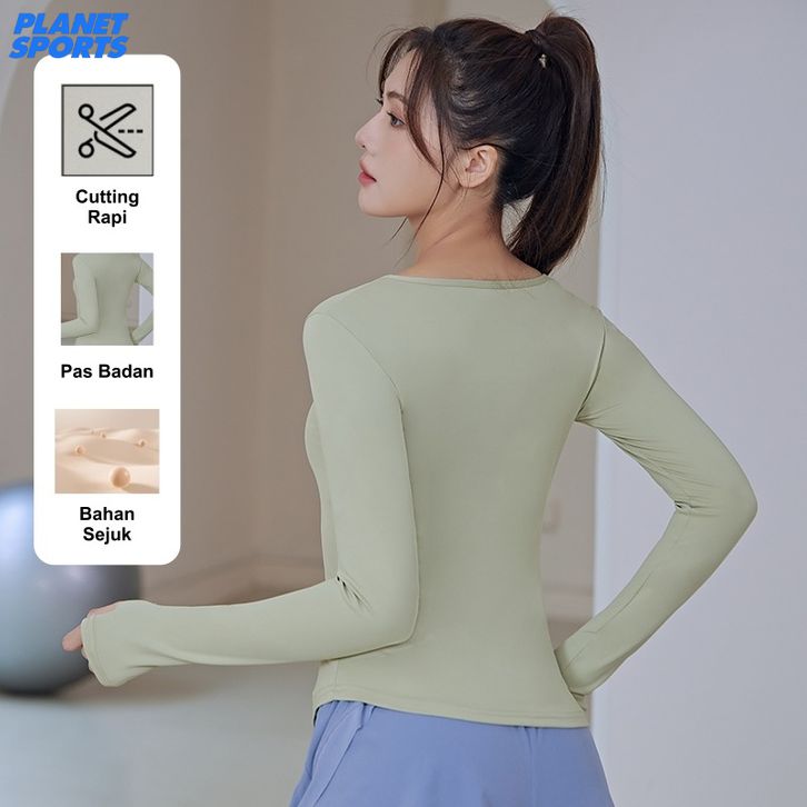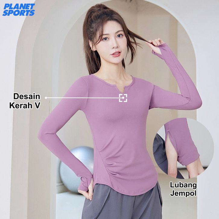 Baju Olahraga Baju Atasan Olahraga Wanita Lengan Panjang Model V-Neck Kaos Olahraga Senam Yoga Jogging YF078