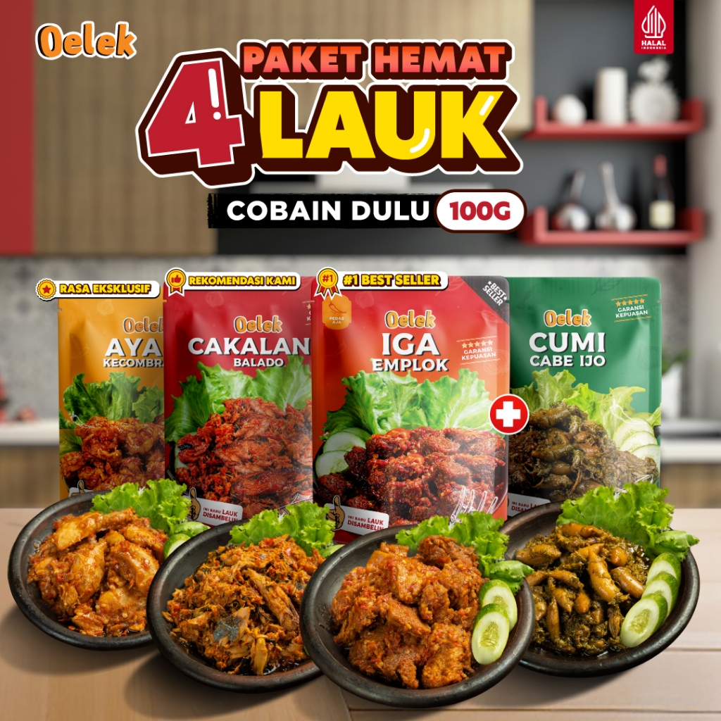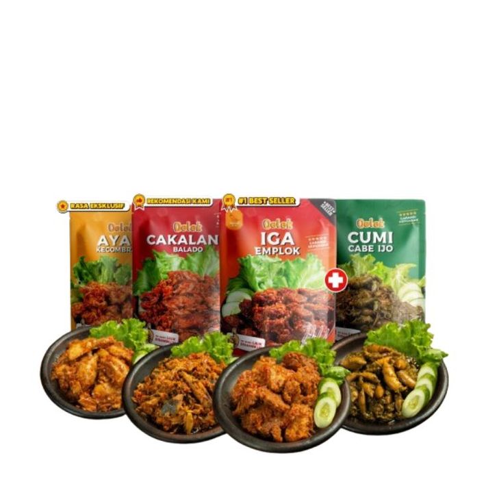 Oelek Paket Cobain Dulu 4 Lauk / Iga Emplok / Cakalang Balado / Cumi Cabe Ijo / Ayam Kecombrang / Lauk Siap Saji